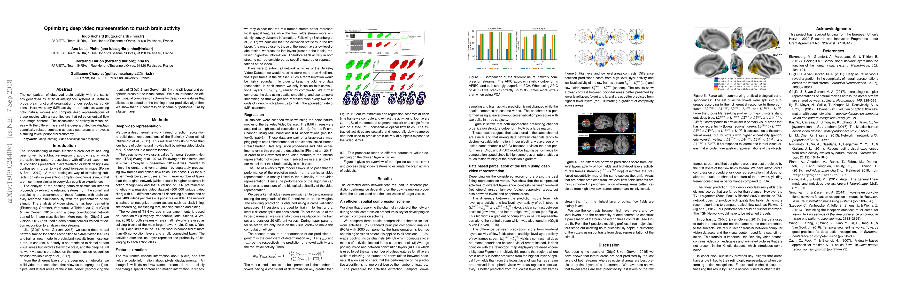 This research investigates the correlation between fMRI brain activity in visual areas and deep video representations generated by an AI model using optical flow and image content. The study reveals complex contrasts across visual areas and highlights a significant foveal/peripheral distinction in brain responses.