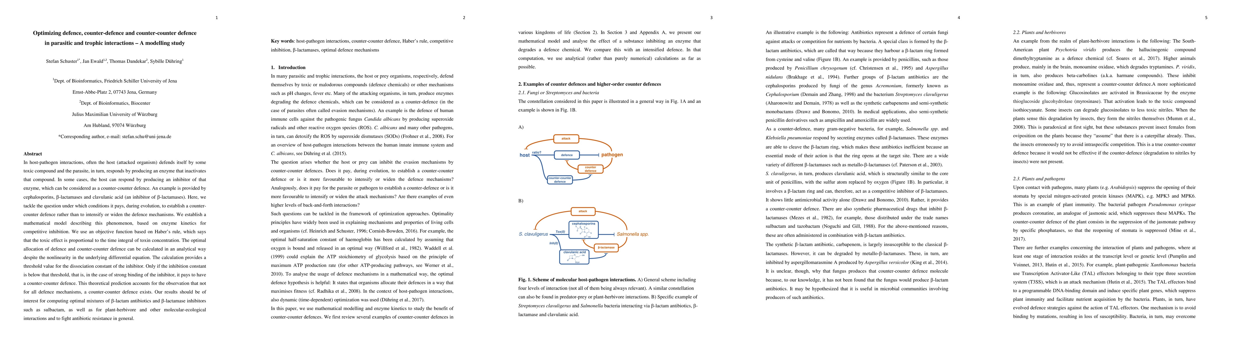 In host-pathogen interactions, often the host (attacked organism) defends itself by some toxic compound and the parasite, in turn, responds by producing an enzyme that inactivates that compound. In some cases, the host can respond by producing an inhibitor of that enzyme, which can be considered as a counter-counter defence. An example is provided by cephalosporins, beta-lactamases and clavulanic acid (an inhibitor of beta-lactamases). Here, we tackle the question under which conditions it pays, during evolution, to establish a counter-counter defence rather than to intensify or widen the defence mechanisms. We establish a mathematical model describing this phenomenon, based on enzyme kinetics for competitive inhibition. We use an objective function based on Haber's rule, which says that the toxic effect is proportional to the time integral of toxin concentration. The optimal allocation of defence and counter-counter defence can be calculated in an analytical way despite the nonlinearity in the underlying differential equation. The calculation provides a threshold value for the dissociation constant of the inhibitor. Only if the inhibition constant is below that threshold, that is, in the case of strong binding of the inhibitor, it pays to have a counter-counter defence. This theoretical prediction accounts for the observation that not for all defence mechanisms, a counter-counter defence exists. Our results should be of interest for computing optimal mixtures of beta-lactam antibiotics and beta-lactamase inhibitors such as sulbactam, as well as for plant-herbivore and other molecular-ecological interactions and to fight antibiotic resistance in general.