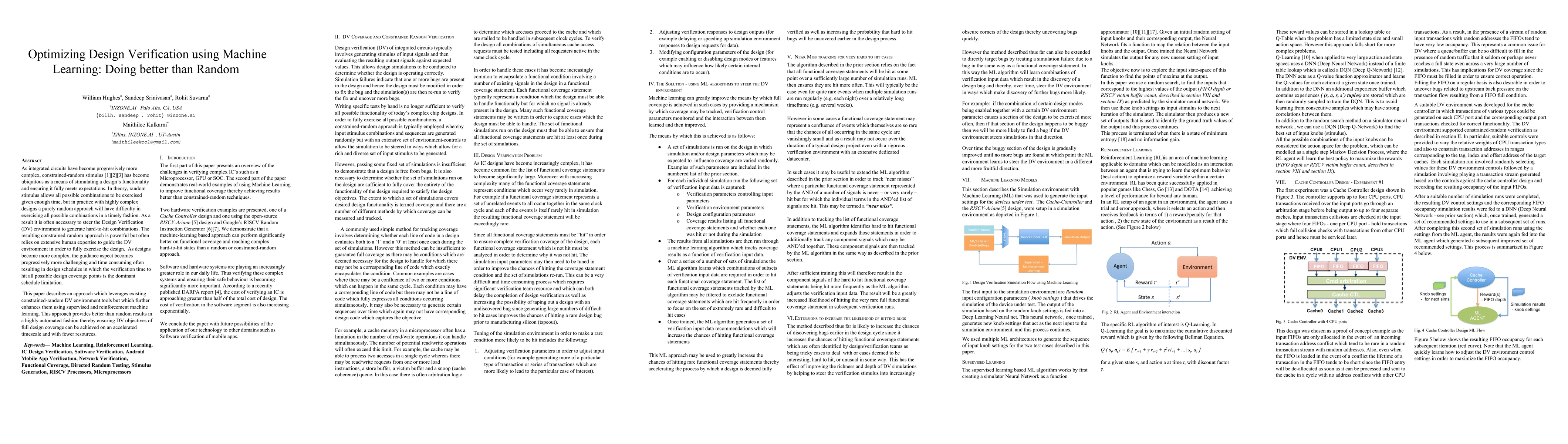 This paper proposes a machine learning-enhanced approach to optimize design verification for complex integrated circuits using supervised and reinforcement learning techniques. The method outperforms traditional random or constrained-random methods by achieving better design coverage and reaching hard-to-hit states more efficiently, thereby accelerating verification schedules and reducing resource demands.