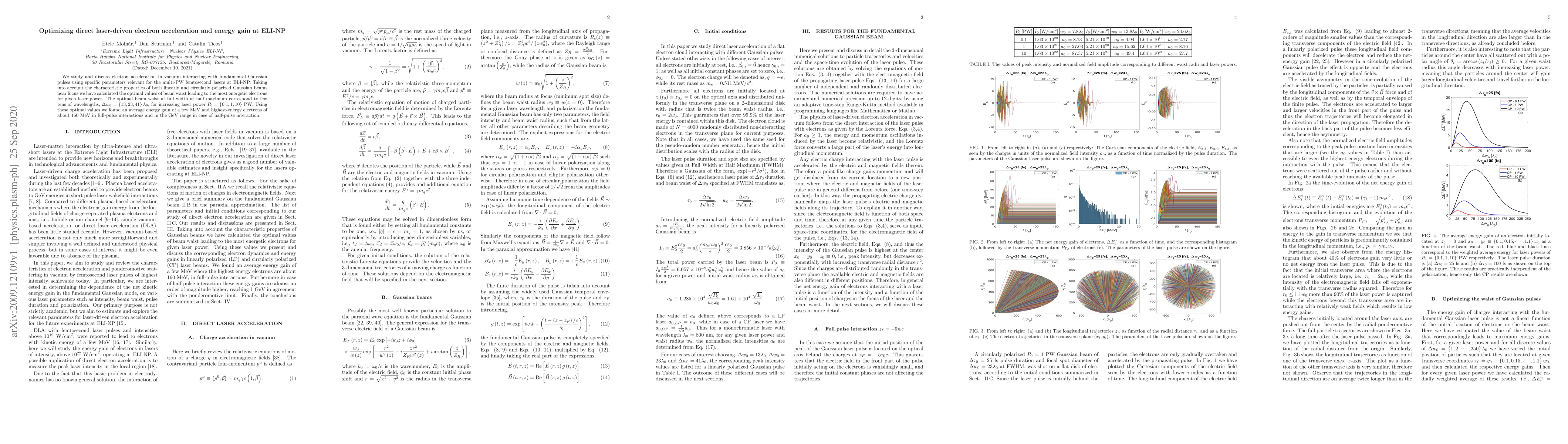 This paper investigates electron acceleration in vacuum using Gaussian pulses from multi-PW femtosecond lasers at ELI-NP, determining optimal beam waists for maximum energy gain. The study finds optimal beam waists of $\Delta w_0 \in \{13,23,41\}\lambda_0$ for laser powers $P_0 \in \{0.1,1,10\}$ PW, achieving average energy gains of a few MeV and highest-energy electrons up to 160 MeV.