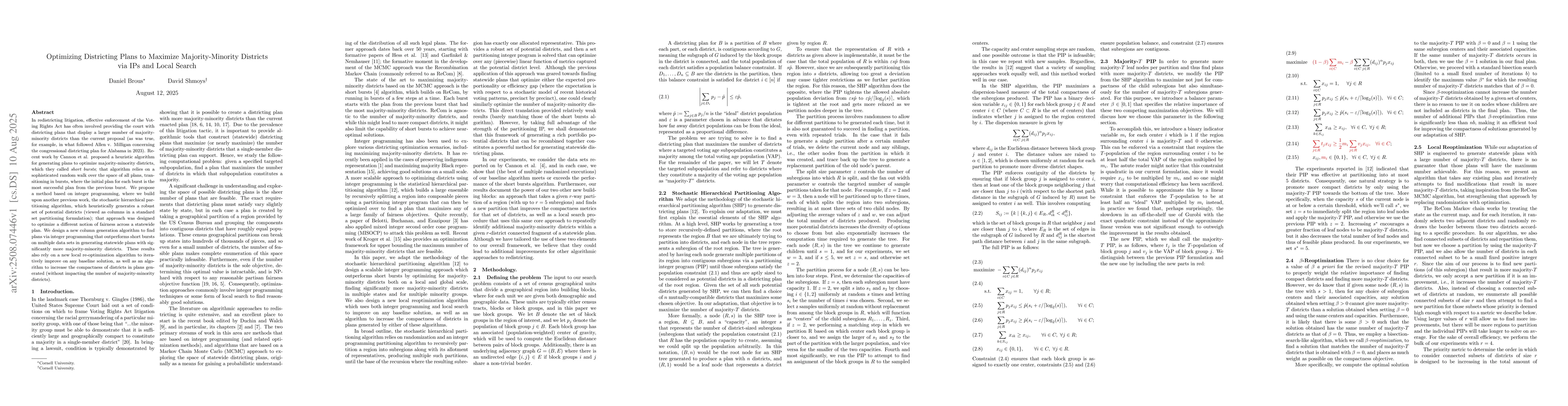The paper presents an integer programming approach combined with column generation and local re-optimization techniques for generating districting plans with a high number of majority-minority districts.