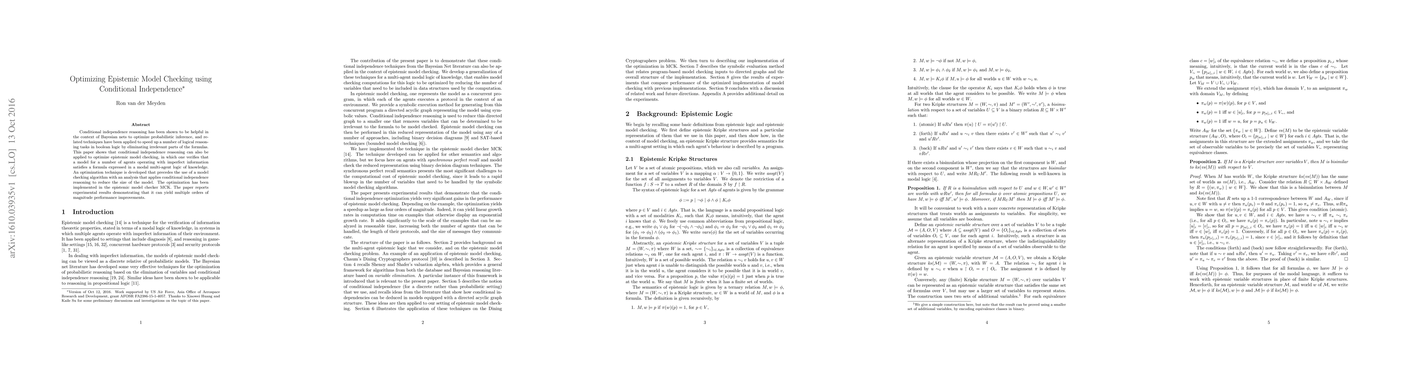 This paper optimizes epistemic model checking using conditional independence, achieving multiple orders of magnitude performance improvements.