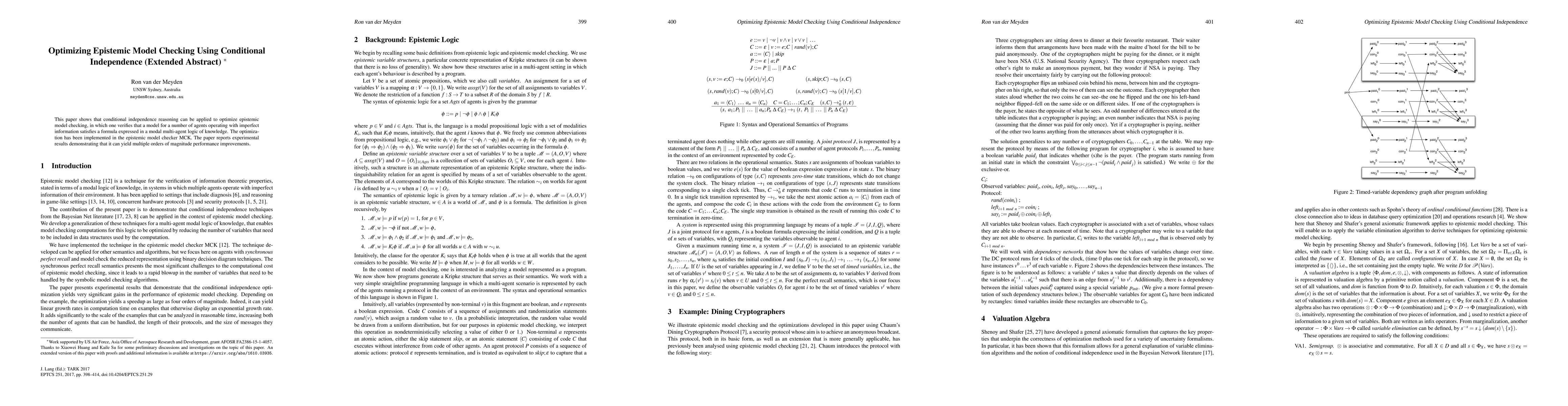 This paper optimizes epistemic model checking using conditional independence, achieving performance improvements of multiple orders of magnitude with its approach.