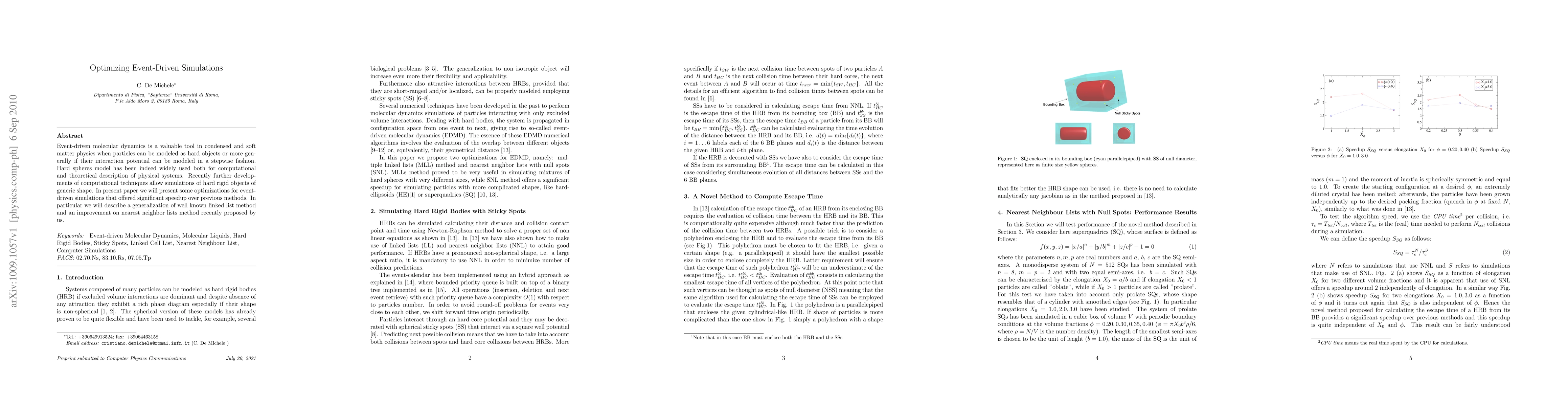 This paper presents optimizations for event-driven molecular dynamics simulations, focusing on hard rigid objects. It introduces a generalized linked list method and an enhanced nearest neighbor list approach, achieving significant speedups over previous techniques.