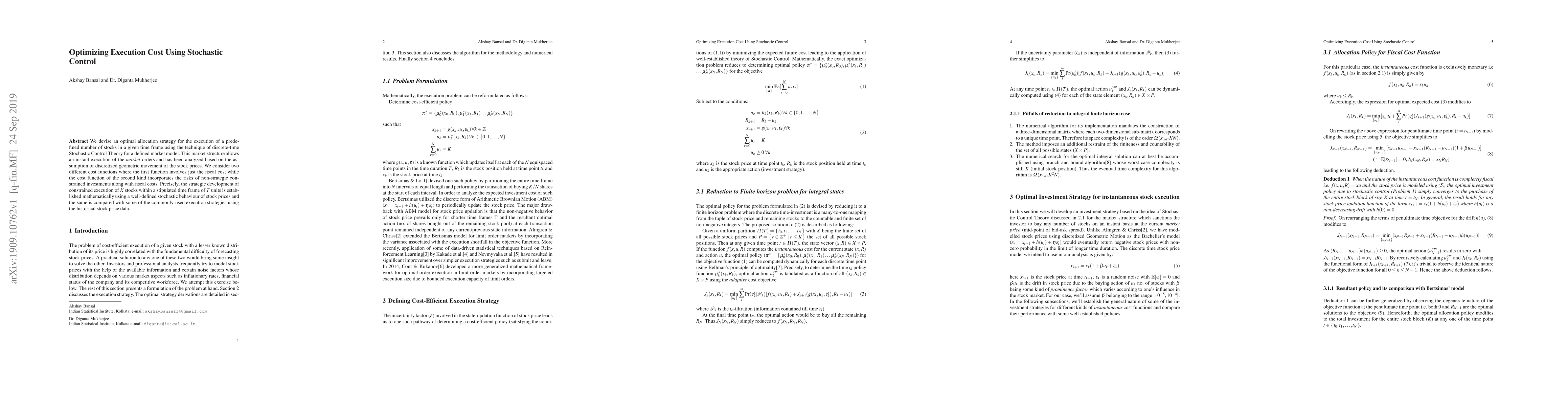 We devise an optimal allocation strategy for the execution of a predefined number of stocks in a given time frame using the technique of discrete-time Stochastic Control Theory for a defined market model. This market structure allows an instant execution of the market orders and has been analyzed based on the assumption of discretized geometric movement of the stock prices. We consider two different cost functions where the first function involves just the fiscal cost while the cost function of the second kind incorporates the risks of non-strategic constrained investments along with fiscal costs. Precisely, the strategic development of constrained execution of K stocks within a stipulated time frame of T units is established mathematically using a well-defined stochastic behaviour of stock prices and the same is compared with some of the commonly-used execution strategies using the historical stock price data.