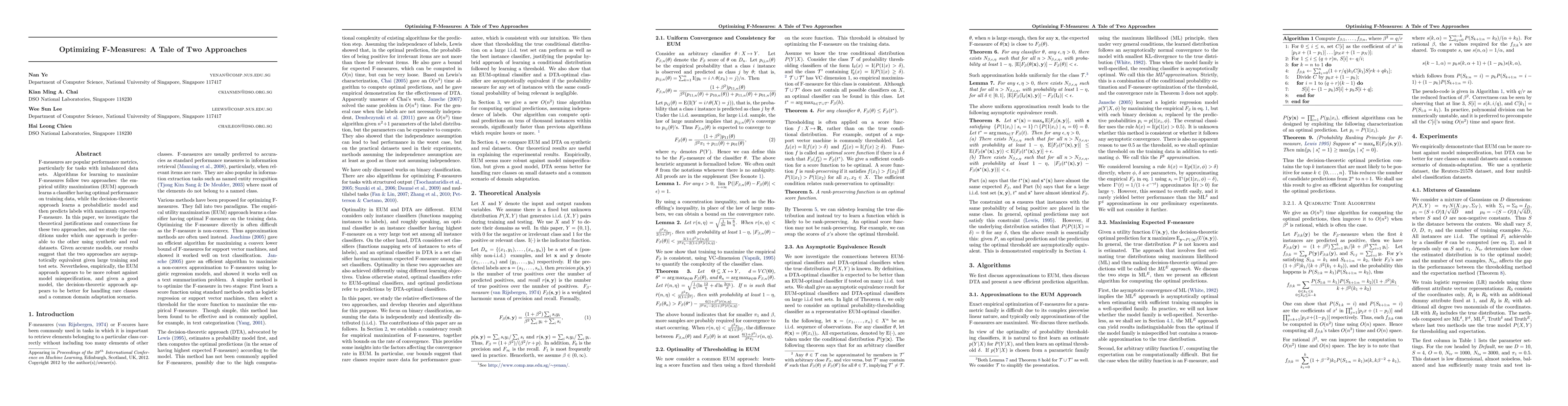This paper explores two methods for optimizing F-measure, a metric for imbalanced datasets. The empirical utility maximization (EUM) approach optimizes performance on training data, while the decision-theoretic approach learns a probabilistic model for prediction. The study finds that given accurate models, both methods are asymptotically equivalent with large datasets. However, EUM shows more robustness to model misspecification, and the decision-theoretic approach performs better with rare classes and in domain adaptation scenarios.