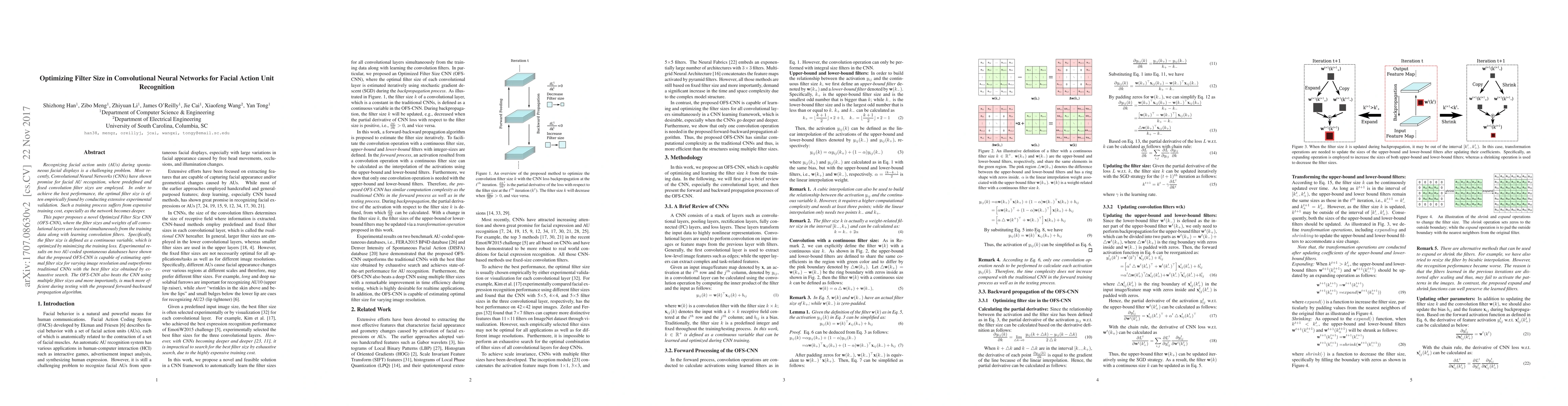 This research paper introduces an Optimized Filter Size CNN (OFS-CNN) to enhance facial action unit recognition. Unlike traditional CNNs that use fixed filter sizes, the OFS-CNN learns optimal filter sizes and weights simultaneously during training, leading to improved performance and efficiency compared to methods that require extensive empirical validation.