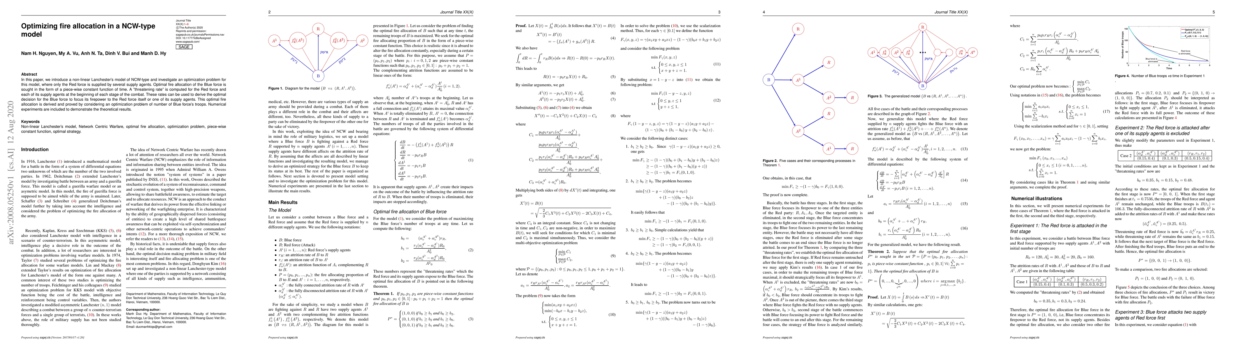 In this paper, we introduce a non-linear Lanchester model of NCW-type and investigate an optimization problem for this model, where only the Red force is supplied by several supply agents. Optimal fire allocation of the Blue force is sought in the form of a piece-wise constant function of time. A threatening rate is computed for the Red force and each of its supply agents at the beginning of each stage of the combat. These rates can be used to derive the optimal decision for the Blue force to focus its firepower to the Red force itself or one of its supply agents. This optimal fire allocation is derived and proved by considering an optimization problem of number of Blue force troops. Numerical experiments are included to demonstrate the theoretical results.