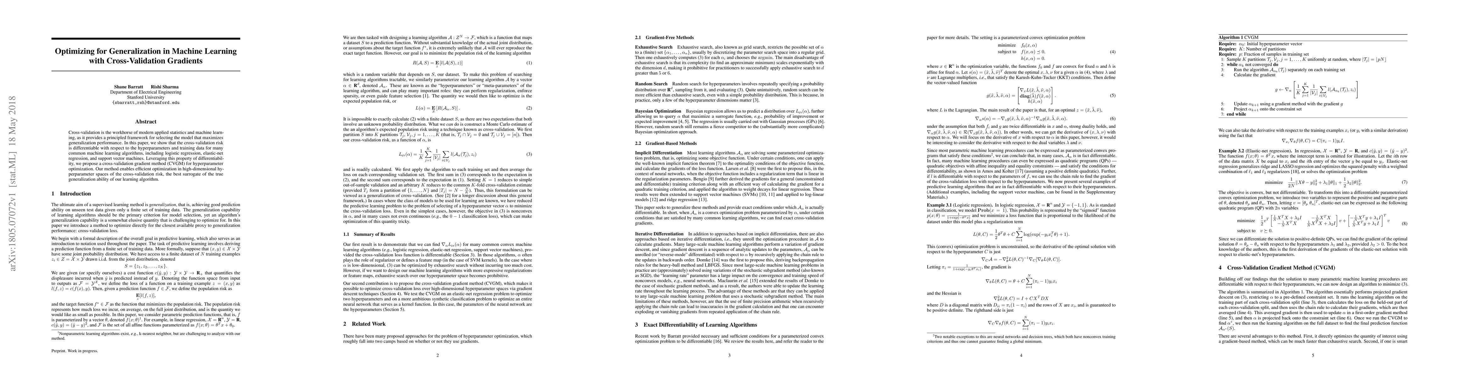 The paper proposes a Cross-Validation Gradient Method (CVGM) for hyperparameter optimization in machine learning, leveraging the differentiability of the cross-validation risk with respect to hyperparameters and training data for various algorithms like logistic regression, elastic-net regression, and support vector machines.