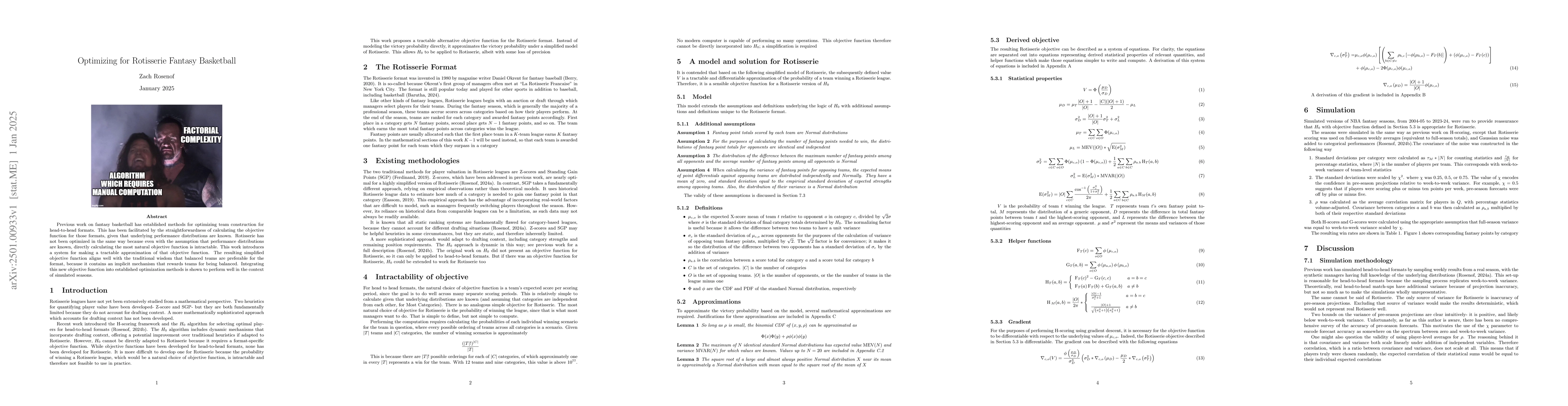 Previous work on fantasy basketball has established methods for optimizing team construction for head-to-head formats. This has been facilitated by the straightforwardness of calculating the objective function for those formats, given that underlying performance distributions are known. Rotisserie has not been optimized in the same way because even with the assumption that performance distributions are known, directly calculating the most natural objective function is intractable. This work introduces a system for making a tractable approximation of that objective function. The resulting simplified objective function aligns well with the traditional wisdom that balanced teams are preferable for the format, because it contains an implicit mechanism that rewards teams for being balanced. Integrating this new objective function into established optimization methods is shown to perform well in the context of simulated seasons.
