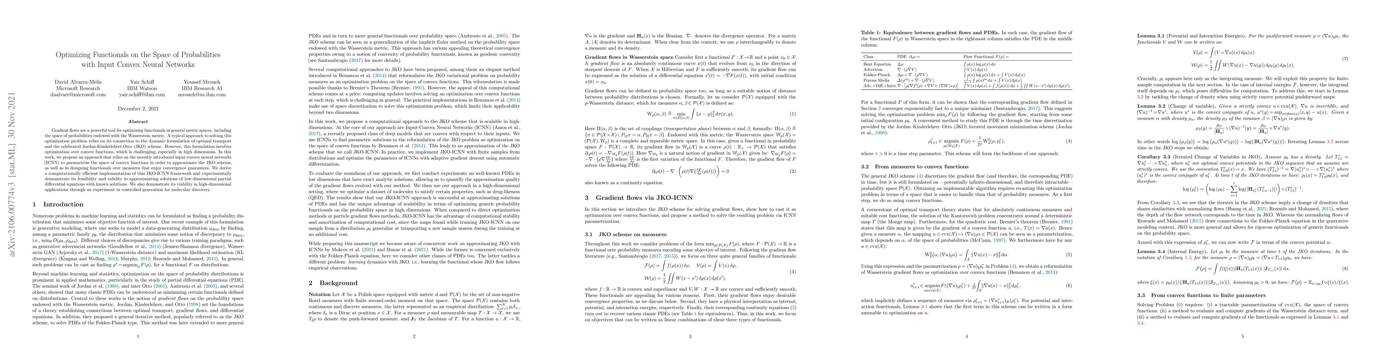 This paper proposes using input-convex neural networks (ICNN) to optimize functionals in the space of probabilities via gradient flows, leveraging the JKO scheme for optimal transport. The approach provides a computationally efficient method for approximating solutions of partial differential equations and demonstrates its effectiveness in both low- and high-dimensional applications, such as molecular discovery.