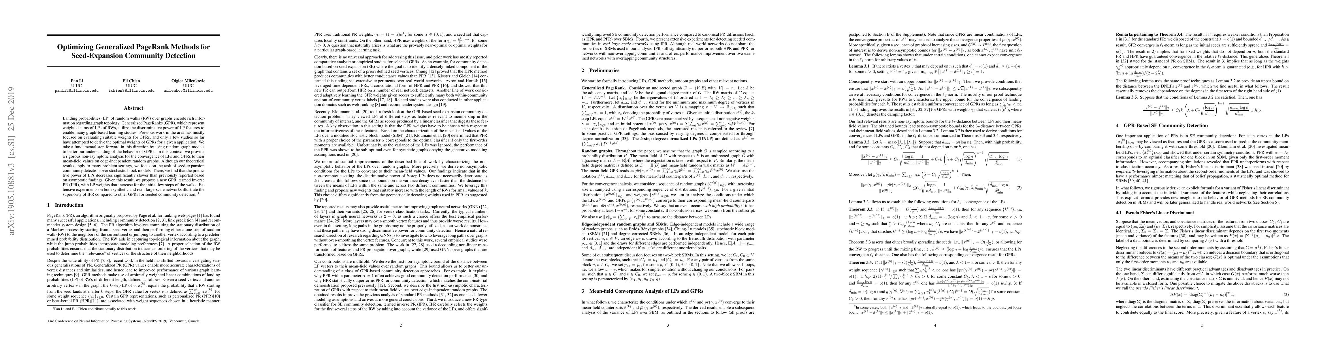 Landing probabilities (LP) of random walks (RW) over graphs encode rich information regarding graph topology. Generalized PageRanks (GPR), which represent weighted sums of LPs of RWs, utilize the discriminative power of LP features to enable many graph-based learning studies. Previous work in the area has mostly focused on evaluating suitable weights for GPRs, and only a few studies so far have attempted to derive the optimal weights of GRPs for a given application. We take a fundamental step forward in this direction by using random graph models to better our understanding of the behavior of GPRs. In this context, we provide a rigorous non-asymptotic analysis for the convergence of LPs and GPRs to their mean-field values on edge-independent random graphs. Although our theoretical results apply to many problem settings, we focus on the task of seed-expansion community detection over stochastic block models. There, we find that the predictive power of LPs decreases significantly slower than previously reported based on asymptotic findings. Given this result, we propose a new GPR, termed Inverse PR (IPR), with LP weights that increase for the initial few steps of the walks. Extensive experiments on both synthetic and real, large-scale networks illustrate the superiority of IPR compared to other GPRs for seeded community detection.