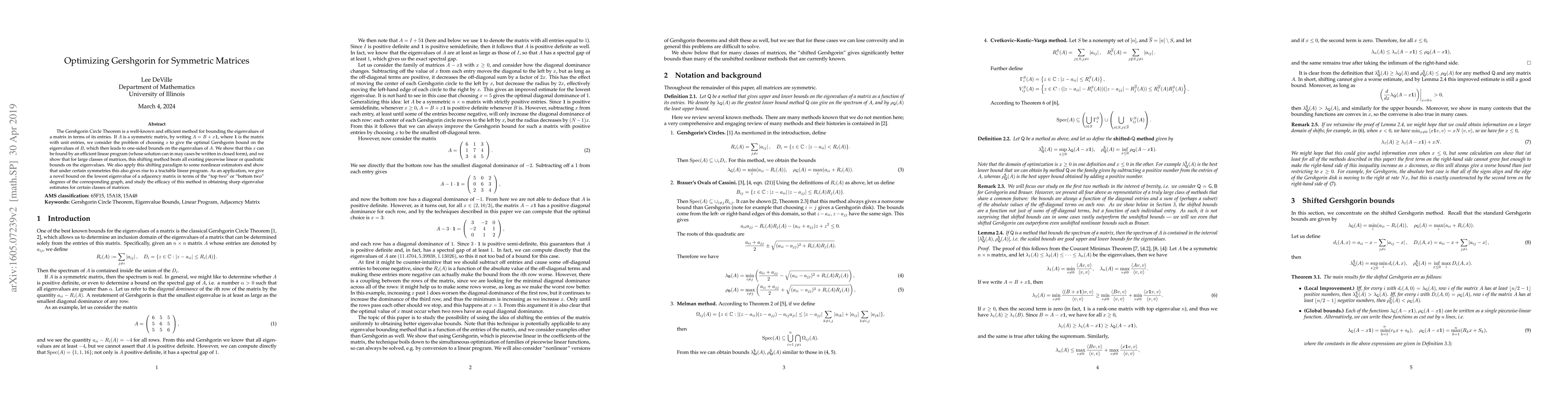 This paper optimizes the Gershgorin Circle Theorem for symmetric matrices by finding an optimal shift $x$ to improve eigenvalue bounds, using an efficient linear program. It demonstrates that this method provides superior bounds compared to existing techniques and applies it to nonlinear estimators and adjacency matrices.