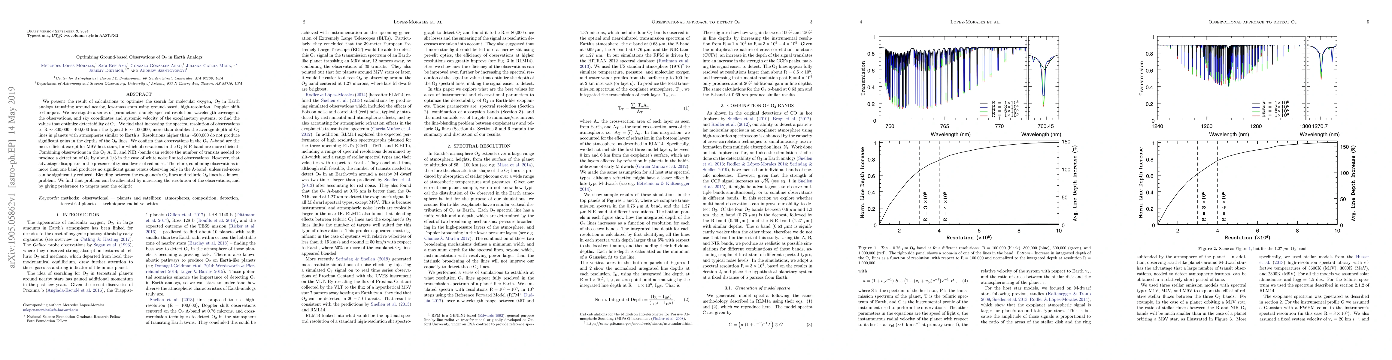 Optimizing ground-based observations of O2 in Earth analogs shows that increasing spectral resolution to R = 300,000-400,000 doubles the detectability of O2 lines, with combining bands reducing transit detection needs by 1/3.