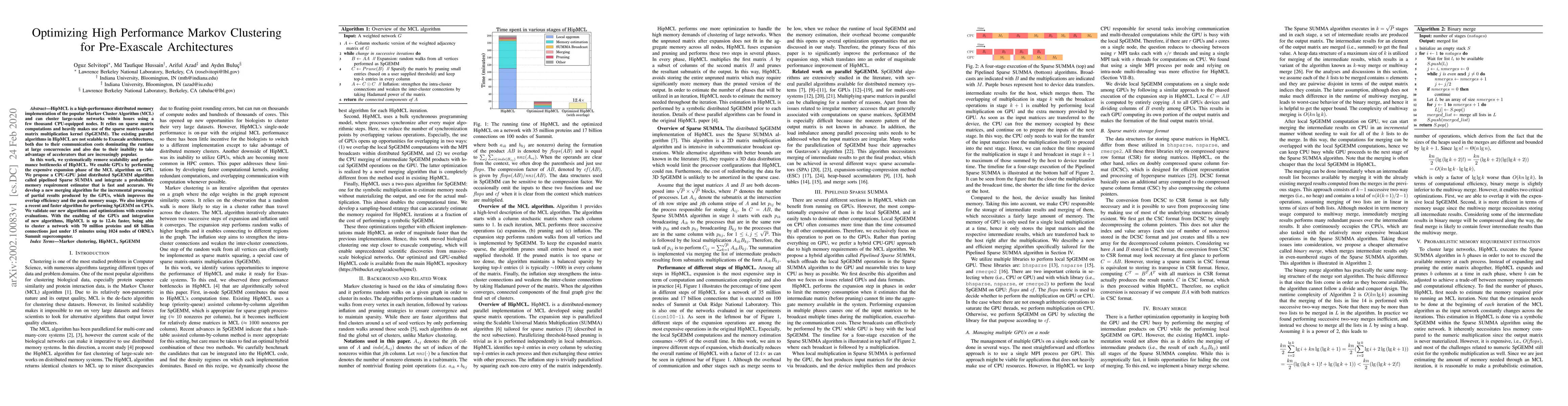 This paper optimizes HipMCL, a high-performance Markov Cluster Algorithm implementation, to scale for pre-Exascale architectures. It introduces GPU-based processing, a CPU-GPU joint distributed SpGEMM algorithm, and a new merging algorithm, achieving up to 12.4x speedup and enabling clustering of large-scale networks within minutes on supercomputers.