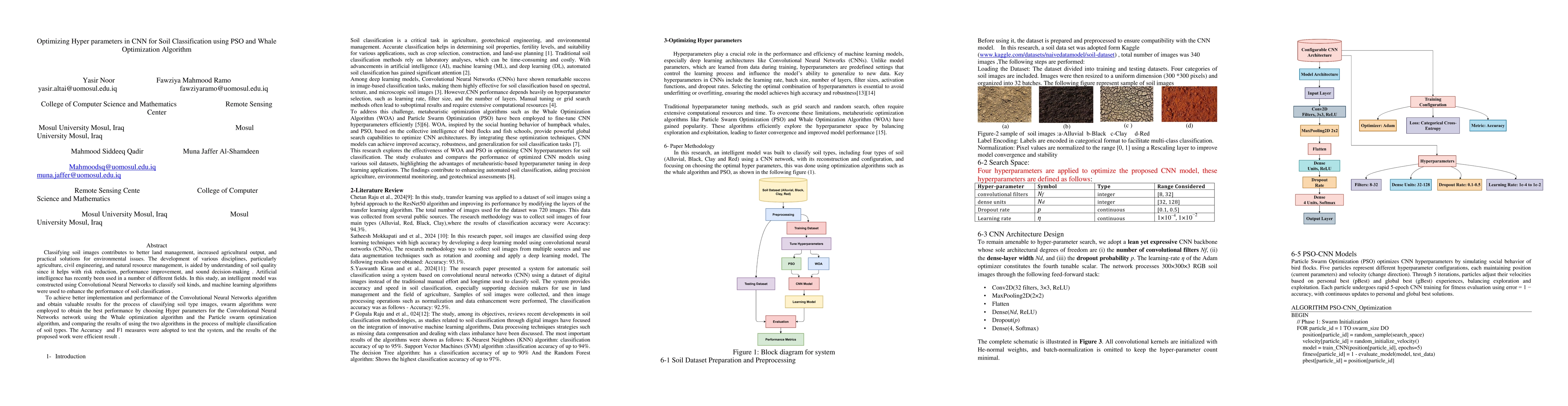 Classifying soil images contributes to better land management, increased agricultural output, and practical solutions for environmental issues. The development of various disciplines, particularly agriculture, civil engineering, and natural resource management, is aided by understanding of soil quality since it helps with risk reduction, performance improvement, and sound decision-making . Artificial intelligence has recently been used in a number of different fields. In this study, an intelligent model was constructed using Convolutional Neural Networks to classify soil kinds, and machine learning algorithms were used to enhance the performance of soil classification . To achieve better implementation and performance of the Convolutional Neural Networks algorithm and obtain valuable results for the process of classifying soil type images, swarm algorithms were employed to obtain the best performance by choosing Hyper parameters for the Convolutional Neural Networks network using the Whale optimization algorithm and the Particle swarm optimization algorithm, and comparing the results of using the two algorithms in the process of multiple classification of soil types. The Accuracy and F1 measures were adopted to test the system, and the results of the proposed work were efficient result