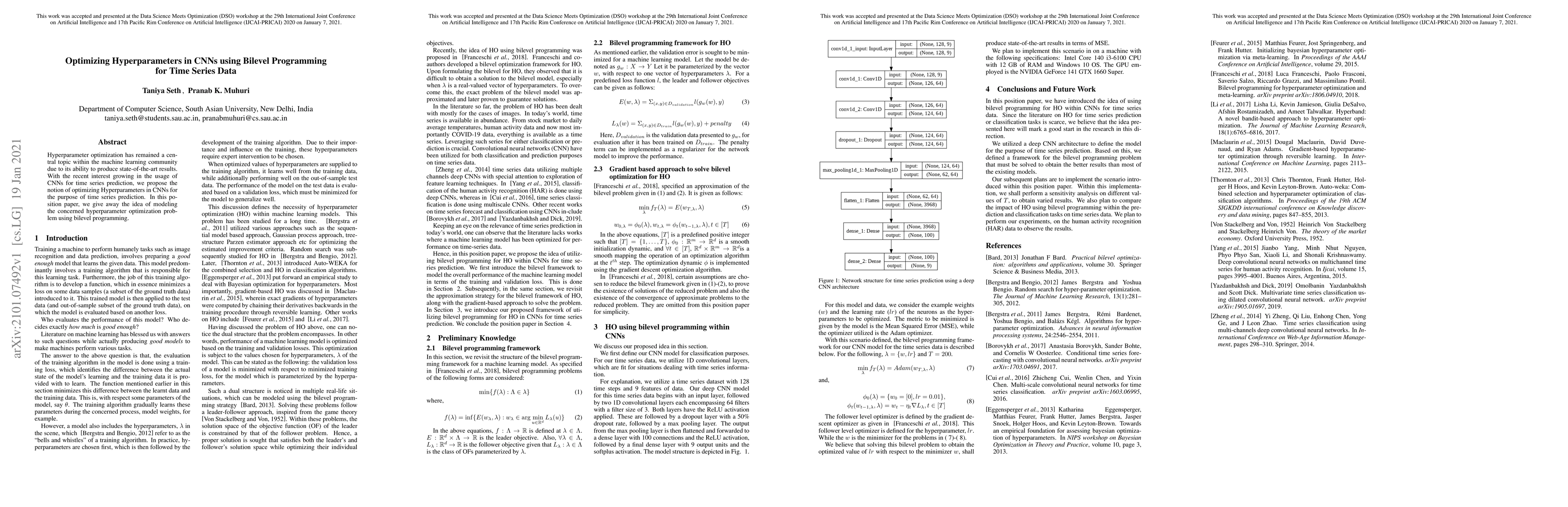 Hyperparameter optimization has remained a central topic within the machine learning community due to its ability to produce state-of-the-art results. With the recent interest growing in the usage of CNNs for time series prediction, we propose the notion of optimizing Hyperparameters in CNNs for the purpose of time series prediction. In this position paper, we give away the idea of modeling the concerned hyperparameter optimization problem using bilevel programming.