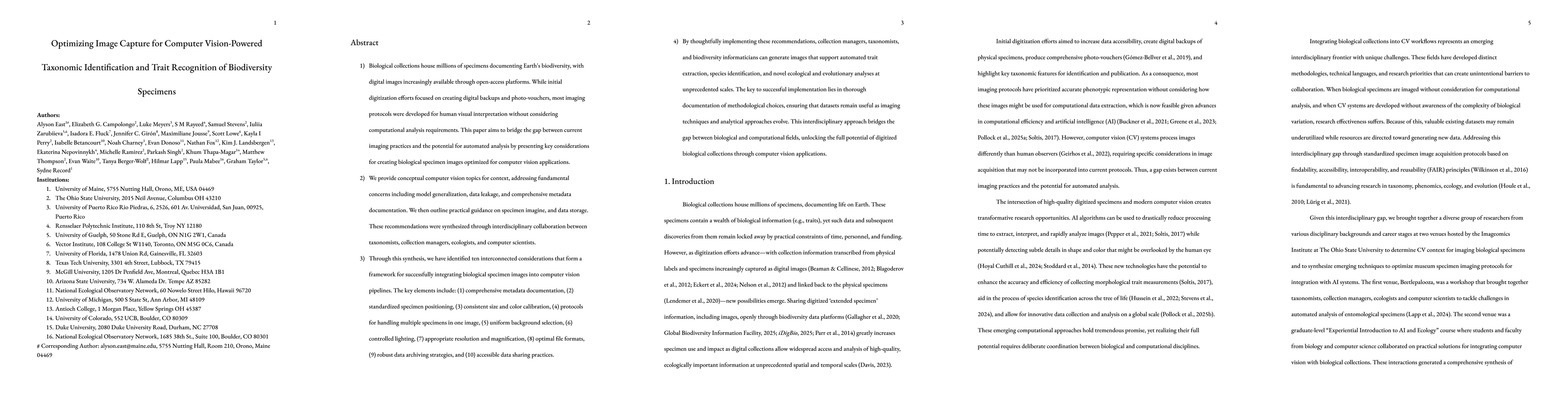 This paper provides guidelines for optimizing image capture for computer vision applications in biodiversity research, focusing on metadata documentation, specimen positioning, lighting, and data storage.