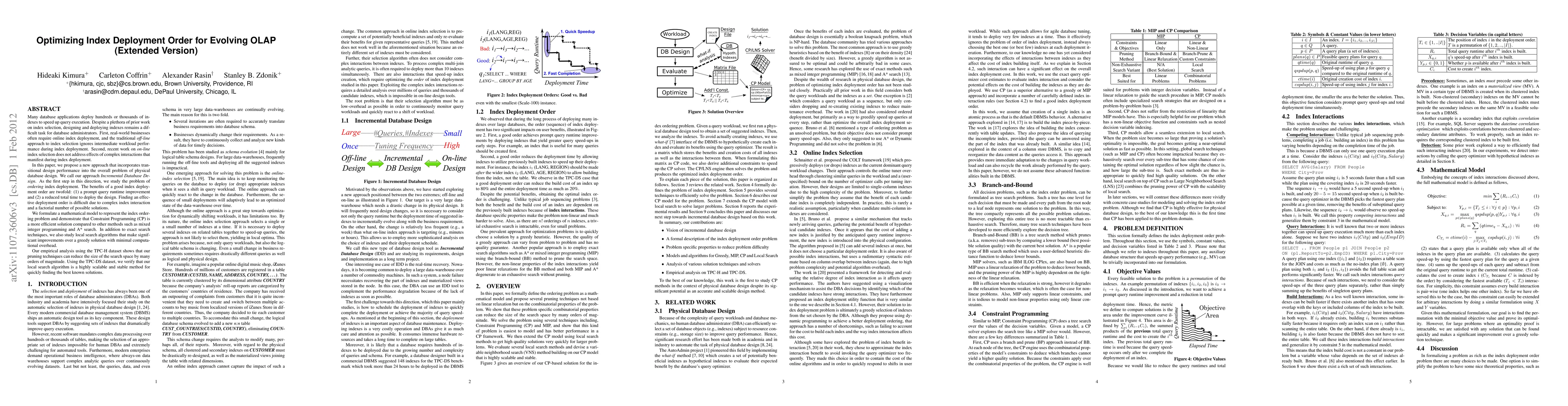 Query workloads and database schemas in OLAP applications are becoming increasingly complex. Moreover, the queries and the schemas have to continually \textit{evolve} to address business requirements. During such repetitive transitions, the \textit{order} of index deployment has to be considered while designing the physical schemas such as indexes and MVs. An effective index deployment ordering can produce (1) a prompt query runtime improvement and (2) a reduced total deployment time. Both of these are essential qualities of design tools for quickly evolving databases, but optimizing the problem is challenging because of complex index interactions and a factorial number of possible solutions. We formulate the problem in a mathematical model and study several techniques for solving the index ordering problem. We demonstrate that Constraint Programming (CP) is a more flexible and efficient platform to solve the problem than other methods such as mixed integer programming and A* search. In addition to exact search techniques, we also studied local search algorithms to find near optimal solution very quickly. Our empirical analysis on the TPC-H dataset shows that our pruning techniques can reduce the size of the search space by tens of orders of magnitude. Using the TPC-DS dataset, we verify that our local search algorithm is a highly scalable and stable method for quickly finding a near-optimal solution.