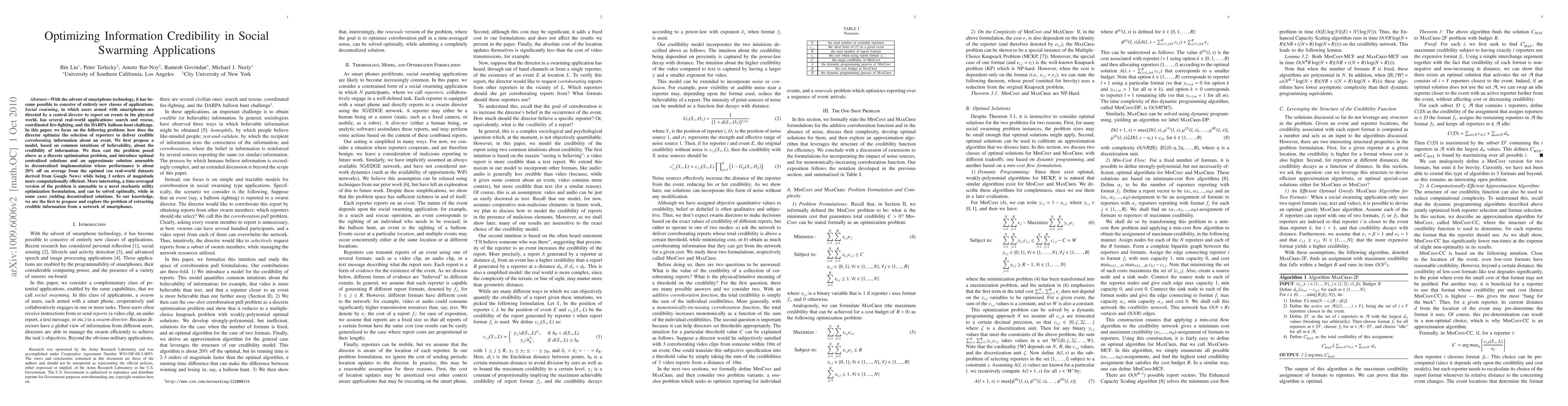 Researchers developed a method to optimize information credibility in social swarming applications, allowing for accurate reporting of events in real-time. Their approach provides 20% less performance than optimal solutions but is 3 orders of magnitude more computationally efficient.
