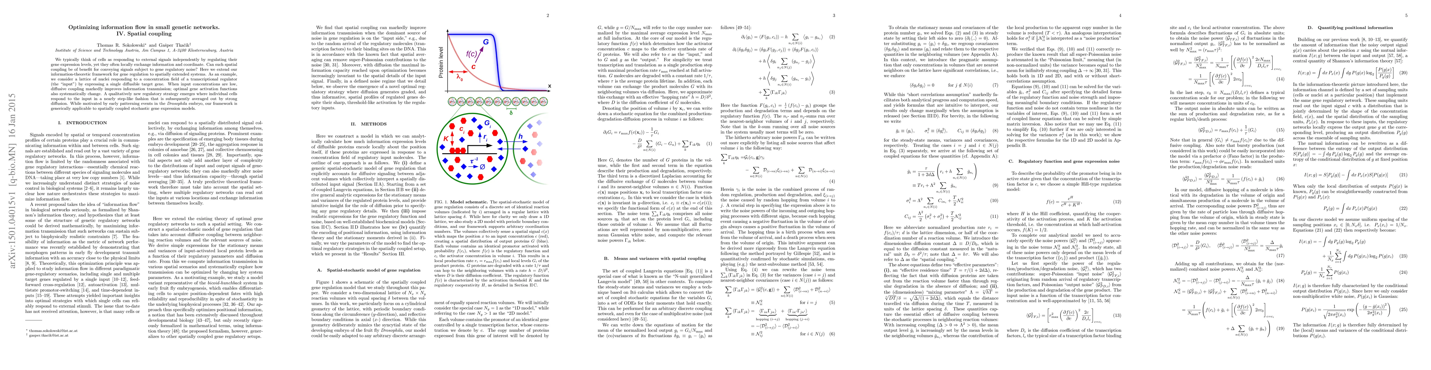 We typically think of cells as responding to external signals independently by regulating their gene expression levels, yet they often locally exchange information and coordinate. Can such spatial coupling be of benefit for conveying signals subject to gene regulatory noise? Here we extend our information-theoretic framework for gene regulation to spatially extended systems. As an example, we consider a lattice of nuclei responding to a concentration field of a transcriptional regulator (the "input") by expressing a single diffusible target gene. When input concentrations are low, diffusive coupling markedly improves information transmission; optimal gene activation functions also systematically change. A qualitatively new regulatory strategy emerges where individual cells respond to the input in a nearly step-like fashion that is subsequently averaged out by strong diffusion. While motivated by early patterning events in the Drosophila embryo, our framework is generically applicable to spatially coupled stochastic gene expression models.