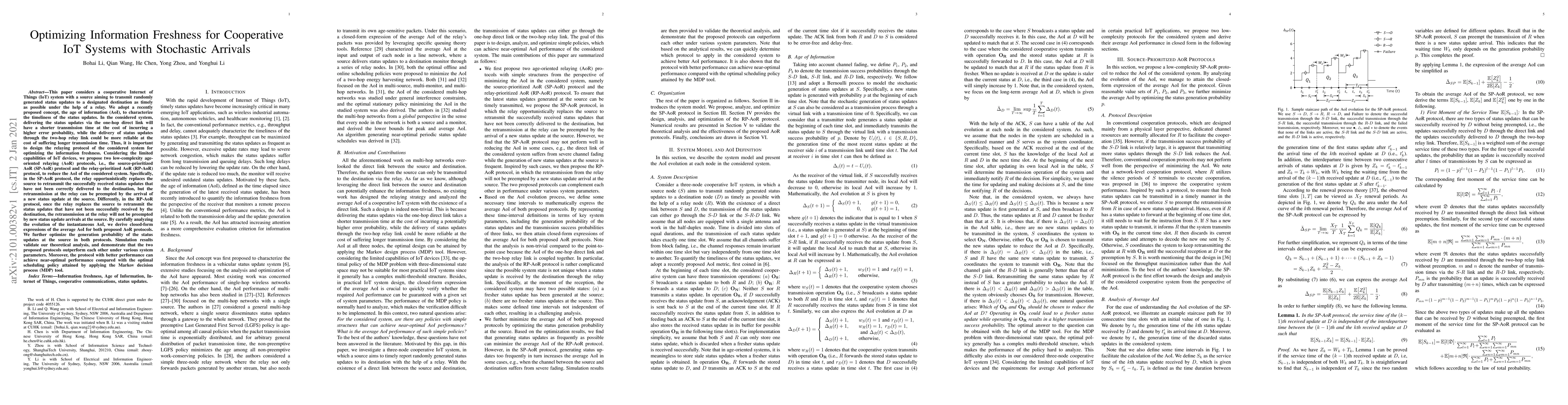 This paper proposes two low-complexity relaying protocols, SP-AoR and RP-AoR, to optimize information freshness in cooperative IoT systems with stochastic arrivals. The protocols aim to minimize the age of information (AoI) by balancing transmission time and error probability, and simulation results show they outperform each other under different conditions, achieving near-optimal performance compared to an optimal Markov decision process-based policy.