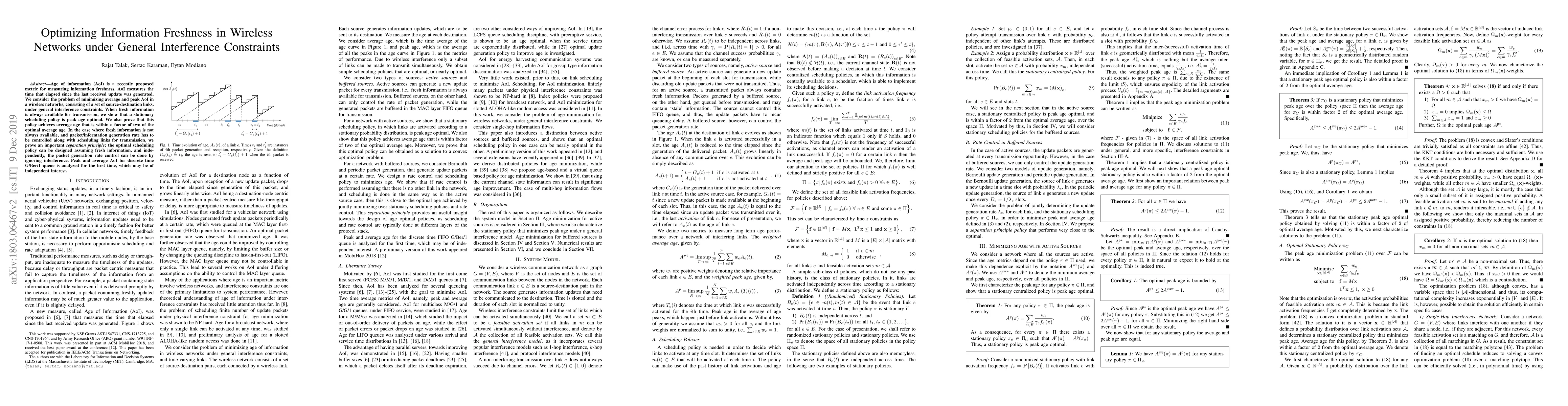 This paper optimizes information freshness in wireless networks under interference constraints, showing that a stationary scheduling policy minimizes peak AoI and achieves average age within a factor of two of the optimal average age.