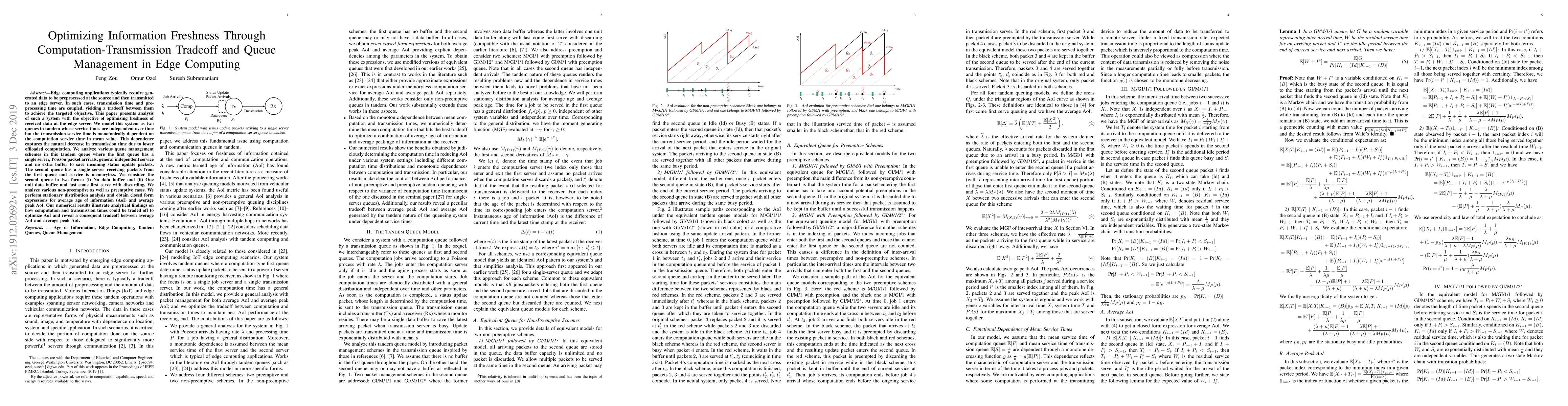 This paper analyzes edge computing systems where data freshness is optimized by managing the tradeoff between computation and transmission times. It models the system as two tandem queues and examines various queue management strategies, deriving closed-form expressions for average and peak age of information, and demonstrating how these strategies affect data freshness.