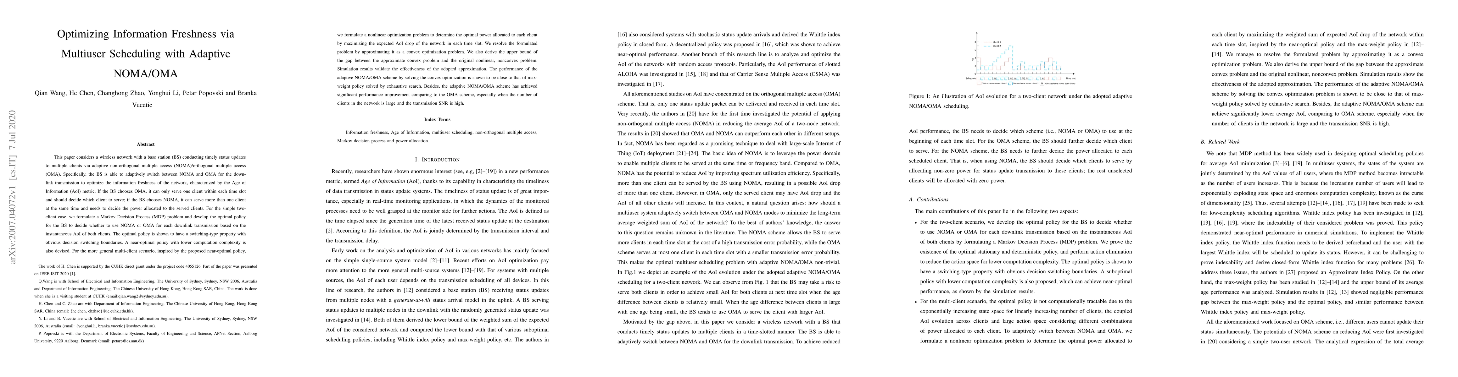 This paper optimizes information freshness in a wireless network by adaptively switching between NOMA and OMA for downlink transmissions, aiming to minimize the Age of Information (AoI). It develops optimal and near-optimal policies for both two-client and multi-client scenarios, leveraging Markov Decision Processes and convex optimization techniques.