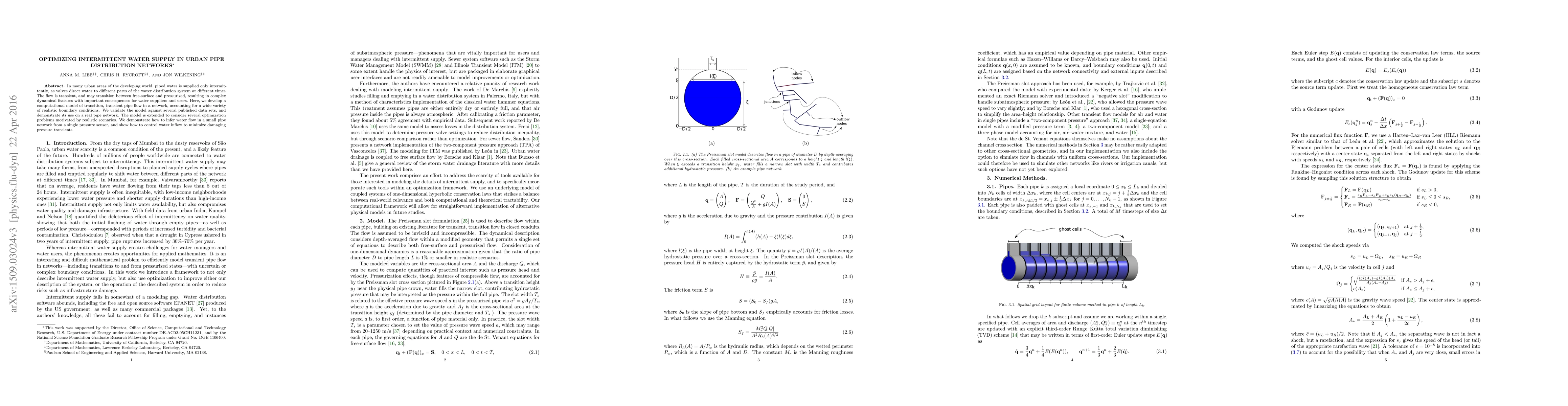 This paper develops a computational model to optimize intermittent water supply in urban pipe networks, focusing on transient flow dynamics and transitions between free-surface and pressurized flow. The model is validated and applied to optimize water distribution, minimizing damaging pressure gradients and inferring flow from limited sensor data.