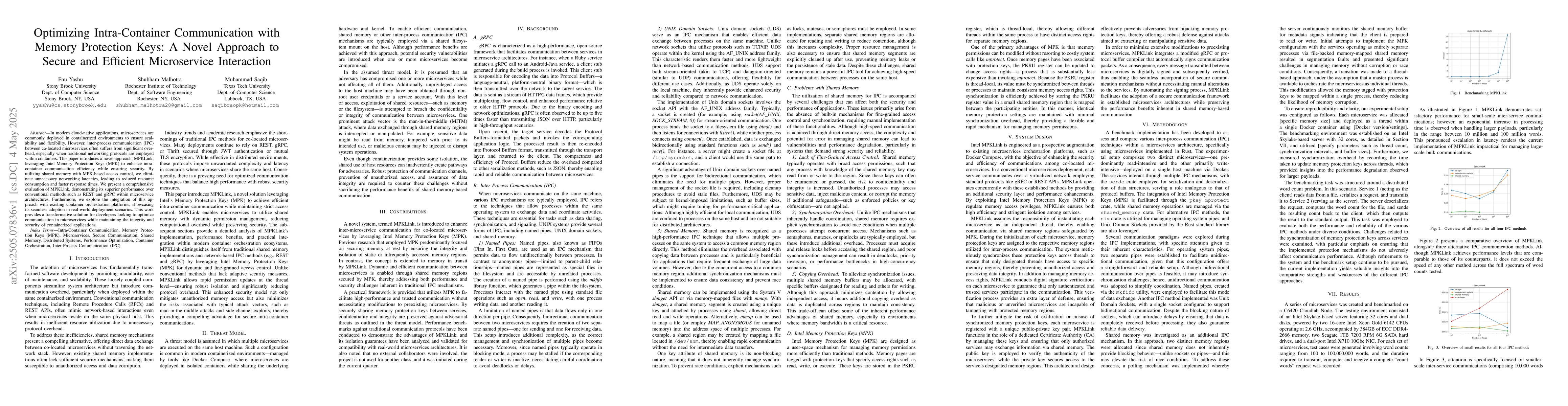 MPKLink, a novel communication method using Intel MPK for secure and efficient intra-container communication in microservices.