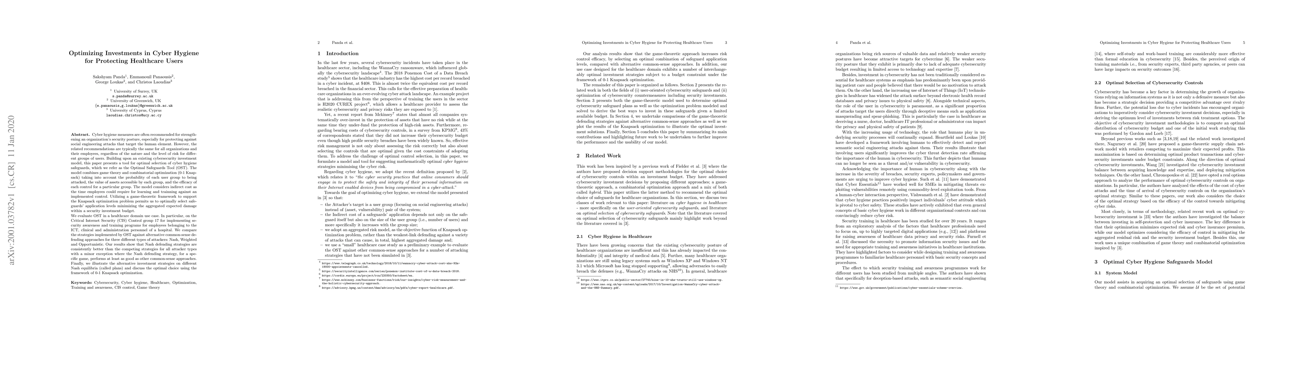 Cyber hygiene measures are often recommended for strengthening an organization's security posture, especially for protecting against social engineering attacks that target the human element. However, the related recommendations are typically the same for all organizations and their employees, regardless of the nature and the level of risk for different groups of users. Building upon an existing cybersecurity investment model, this paper presents a tool for optimal selection of cyber hygiene safeguards, which we refer as the Optimal Safeguards Tool. The model combines game theory and combinatorial optimization taking into account the probability of each user group to being attacked, the value of assets accessible by each group, and the efficacy of each control for a particular group. The model considers indirect cost as the time employees could require for learning and training against an implemented control. Utilizing a game-theoretic framework to support the Knapsack optimization problem permits us to optimally select safeguards' application levels minimizing the aggregated expected damage within a security investment budget. We evaluate OST in a healthcare domain use case. The Critical Internet Security Control group 17 for implementing security awareness and training programs for employees belonging to the ICT, clinical and administration personnel of a hospital. We compare the strategies implemented by OST against alternative common-sense defending approaches for three different types of attackers: Nash, Weighted and Opportunistic. Nash defending strategies are consistently better than the competing strategies for all attacker types with a minor exception where the Nash defending strategy performs at least as good as other common-sense approaches.