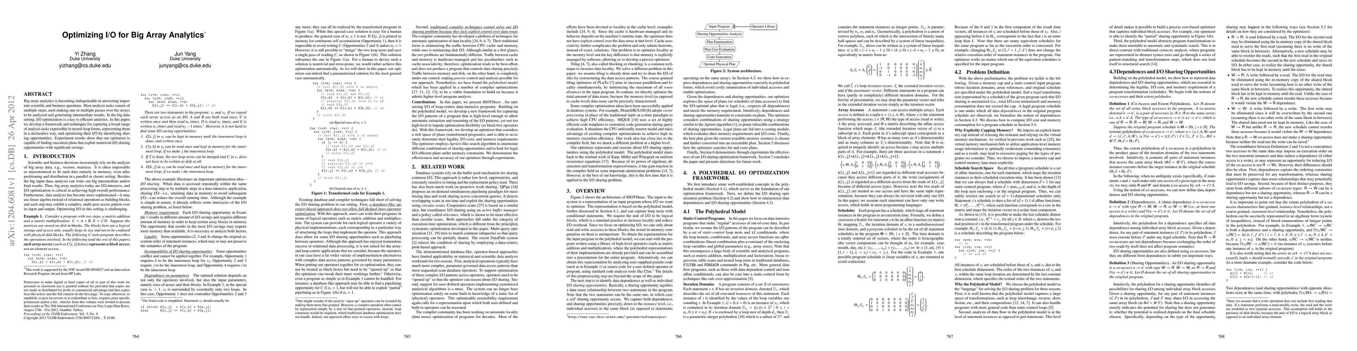 This paper presents a framework for optimizing I/O in big array analytics by capturing nested-loop analysis tasks in a declarative form and identifying I/O sharing opportunities, leading to significant performance improvements in execution plans. Experimental results demonstrate substantial I/O savings through the proposed optimization techniques.
