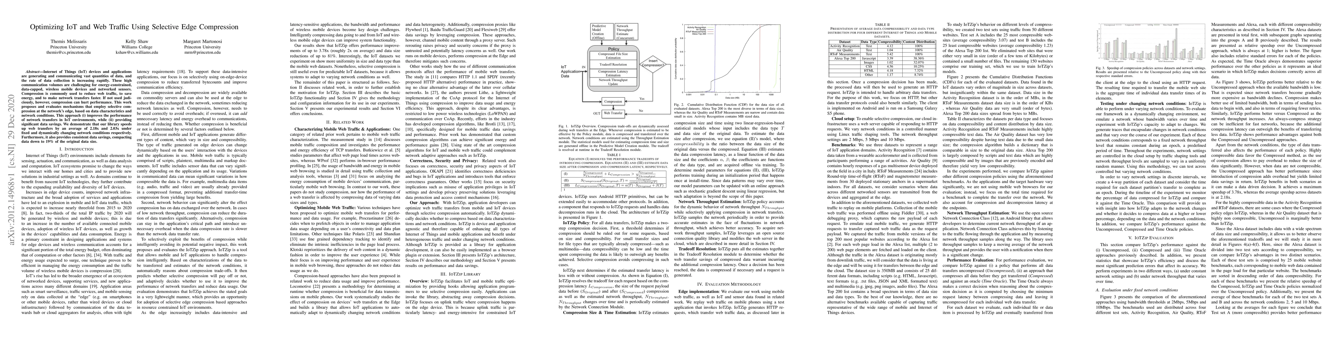 Internet of Things (IoT) devices and applications are generating and communicating vast quantities of data, and the rate of data collection is increasing rapidly. These high communication volumes are challenging for energy-constrained, data-capped, wireless mobile devices and networked sensors. Compression is commonly used to reduce web traffic, to save energy, and to make network transfers faster. If not used judiciously, however, compression can hurt performance. This work proposes and evaluates mechanisms that employ selective compression at the network's edge, based on data characteristics and network conditions. This approach (i) improves the performance of network transfers in IoT environments, while (ii) providing significant data savings. We demonstrate that our library speeds up web transfers by an average of 2.18x and 2.03x under fixed and dynamically changing network conditions respectively. Furthermore, it also provides consistent data savings, compacting data down to 19% of the original data size.