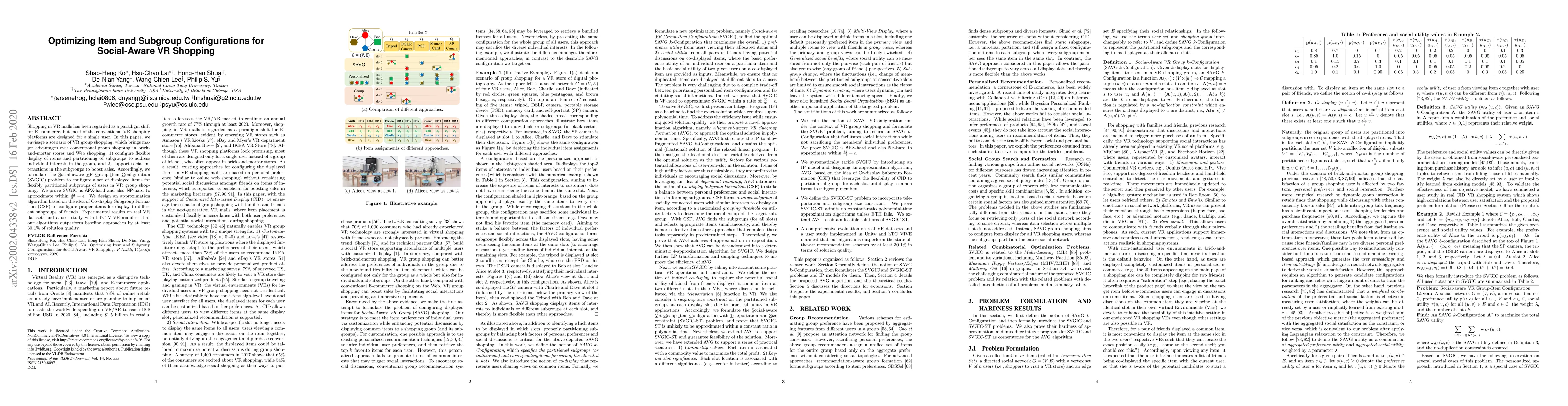 Shopping in VR malls has been regarded as a paradigm shift for E-commerce, but most of the conventional VR shopping platforms are designed for a single user. In this paper, we envisage a scenario of VR group shopping, which brings major advantages over conventional group shopping in brick-and-mortar stores and Web shopping: 1) configure flexible display of items and partitioning of subgroups to address individual interests in the group, and 2) support social interactions in the subgroups to boost sales. Accordingly, we formulate the Social-aware VR Group-Item Configuration (SVGIC) problem to configure a set of displayed items for flexibly partitioned subgroups of users in VR group shopping. We prove SVGIC is NP-hard to approximate within $\frac{32}{31} - \epsilon$. We design an approximation algorithm based on the idea of Co-display Subgroup Formation (CSF) to configure proper items for display to different subgroups of friends. Experimental results on real VR datasets and a user study with hTC VIVE manifest that our algorithms outperform baseline approaches by at least 30.1% of solution quality.