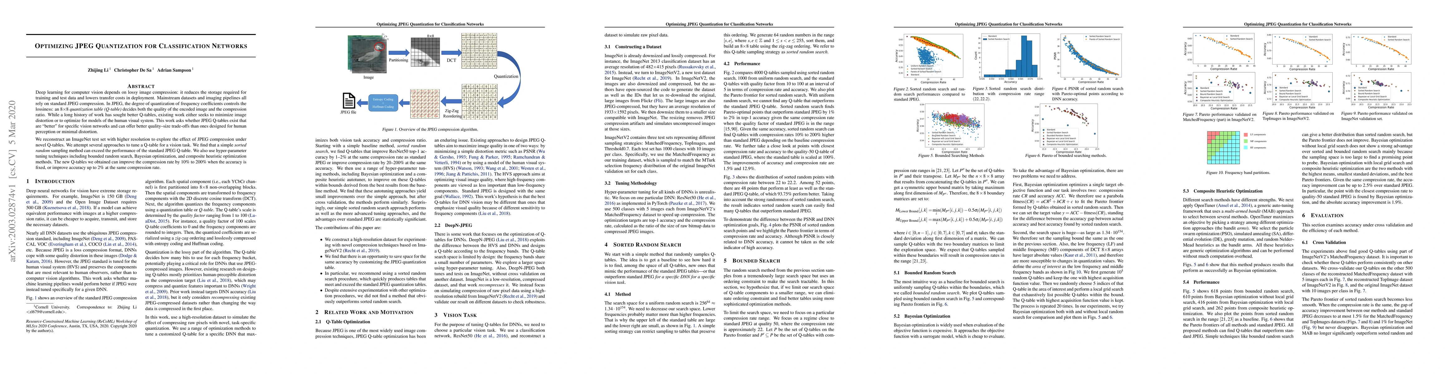 The paper reconstructs an ImageNet test set with higher resolution to explore the effect of JPEG compression under novel Q-tables. It employs several approaches to tune a Q-table for a vision task, including sorted random sampling, bounded random search, Bayesian optimization, and composite heuristic optimization methods.