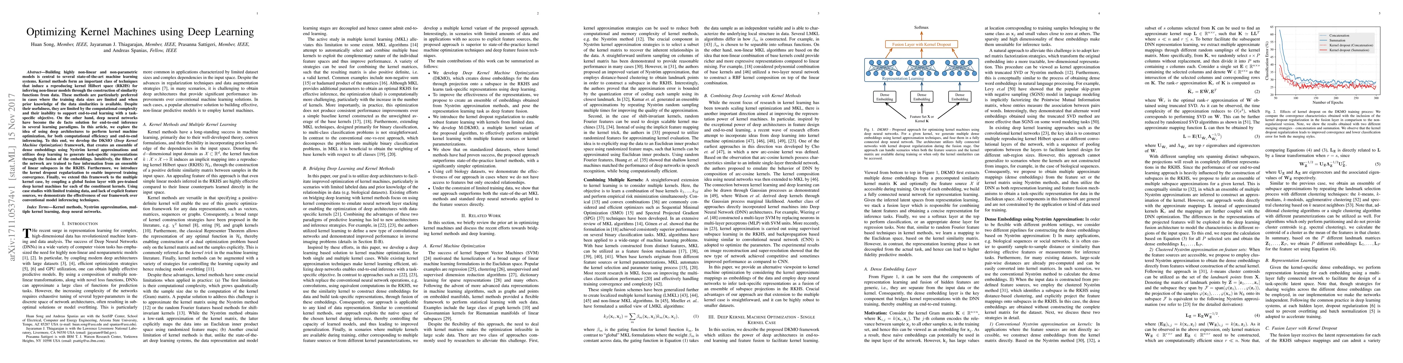 This paper proposes the DKMO framework to optimize kernel machines using deep learning, combining dense embeddings with deep neural networks for efficient end-to-end learning. It introduces kernel dropout regularization and extends the approach to multiple kernels, demonstrating improved performance in scenarios with limited training data.