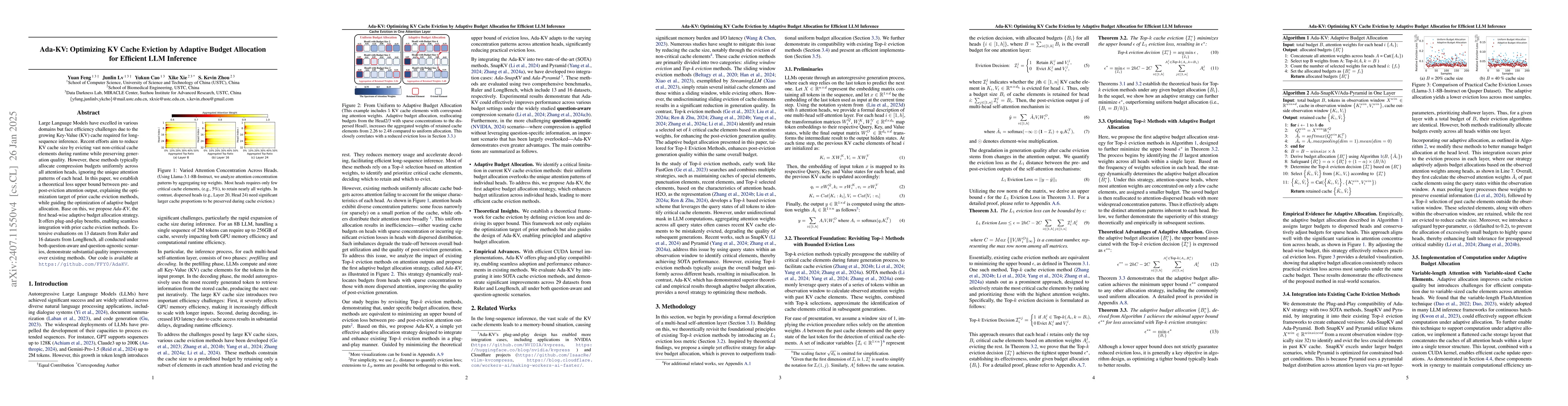 Large Language Models have excelled in various fields but encounter efficiency limitations due to the extensive KV cache required for long sequences inference. Many efforts try to evict non-critical cache elements during runtime, thereby reducing cache size within a given memory budget while preserving generation quality. Our reexamination of their underlying principles discerns that prevailing strategies essentially aim to minimize an upper bound of eviction loss within a specific budget allocation. However, we observe that the current practice of uniformly allocating budgets across different attention heads during the eviction procedure tends to degrade the quality of generation posten-eviction. In light of these findings, we propose a simple yet effective adaptive allocation algorithm that not only theoretically ensures its loss upper bound does not exceed that of previous uniform allocation methods, but also effectively aligns with the characteristics of the self-attention mechanism, thus practically reducing the upper bound. Further, integrating this algorithm with two of the most advanced methods yields Ada-SnapKV and Ada-Pyramid. Extensive experimental validation across 16 datasets and the Needle-in-a-Haystack test confirm that Ada-SnapKV and Ada-Pyramid achieve further enhancements, establishing new benchmarks in state-of-the-art performance.