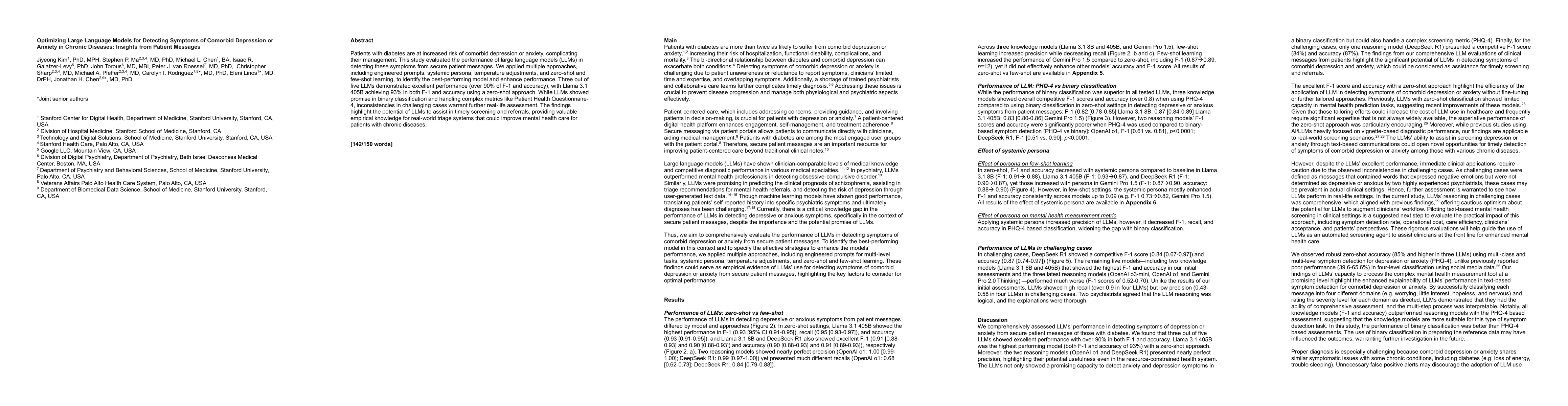 The paper presents a comprehensive evaluation of various state-of-the-art LLMs, applying novel strategies like systemic persona and temperature adjustments to enhance performance in detecting symptoms of comorbid depression or anxiety from patient messages.