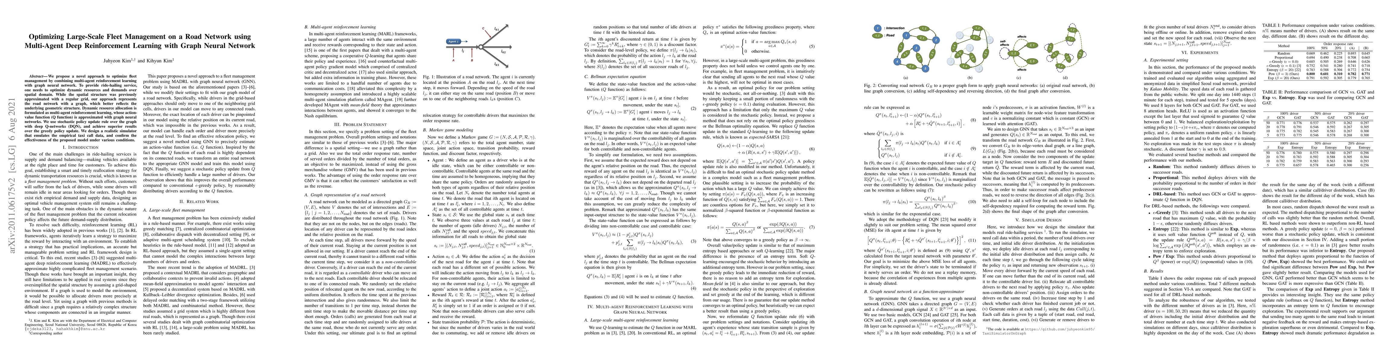 This paper proposes a multi-agent deep reinforcement learning approach with graph neural networks to optimize large-scale fleet management on road networks. It outperforms traditional methods by representing the road network as a graph and using deep Q-networks for dynamic resource allocation.