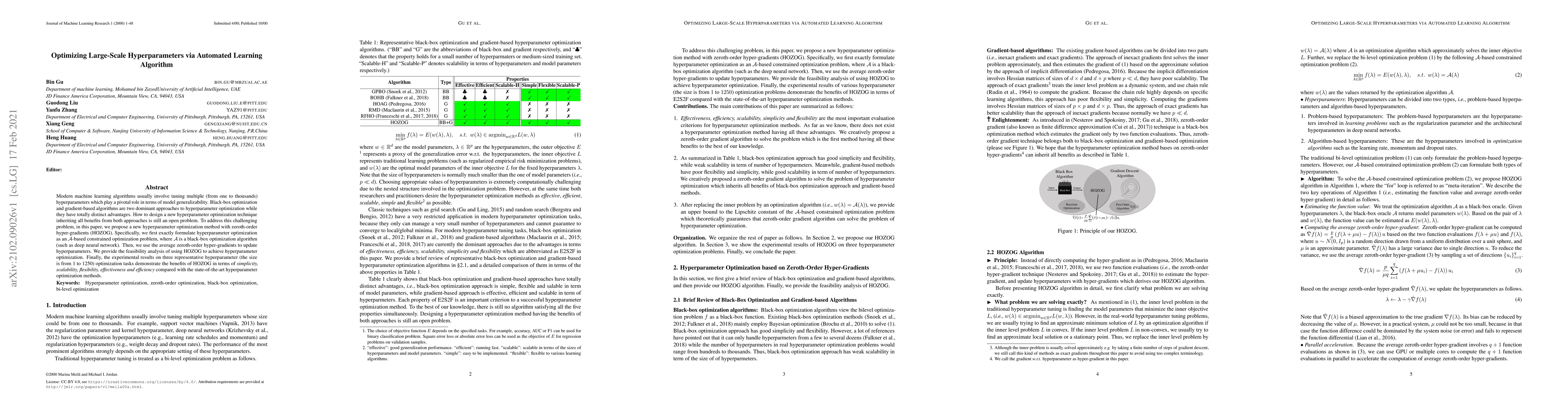Modern machine learning algorithms usually involve tuning multiple (from one to thousands) hyperparameters which play a pivotal role in terms of model generalizability. Black-box optimization and gradient-based algorithms are two dominant approaches to hyperparameter optimization while they have totally distinct advantages. How to design a new hyperparameter optimization technique inheriting all benefits from both approaches is still an open problem. To address this challenging problem, in this paper, we propose a new hyperparameter optimization method with zeroth-order hyper-gradients (HOZOG). Specifically, we first exactly formulate hyperparameter optimization as an A-based constrained optimization problem, where A is a black-box optimization algorithm (such as deep neural network). Then, we use the average zeroth-order hyper-gradients to update hyperparameters. We provide the feasibility analysis of using HOZOG to achieve hyperparameter optimization. Finally, the experimental results on three representative hyperparameter (the size is from 1 to 1250) optimization tasks demonstrate the benefits of HOZOG in terms of simplicity, scalability, flexibility, effectiveness and efficiency compared with the state-of-the-art hyperparameter optimization methods.