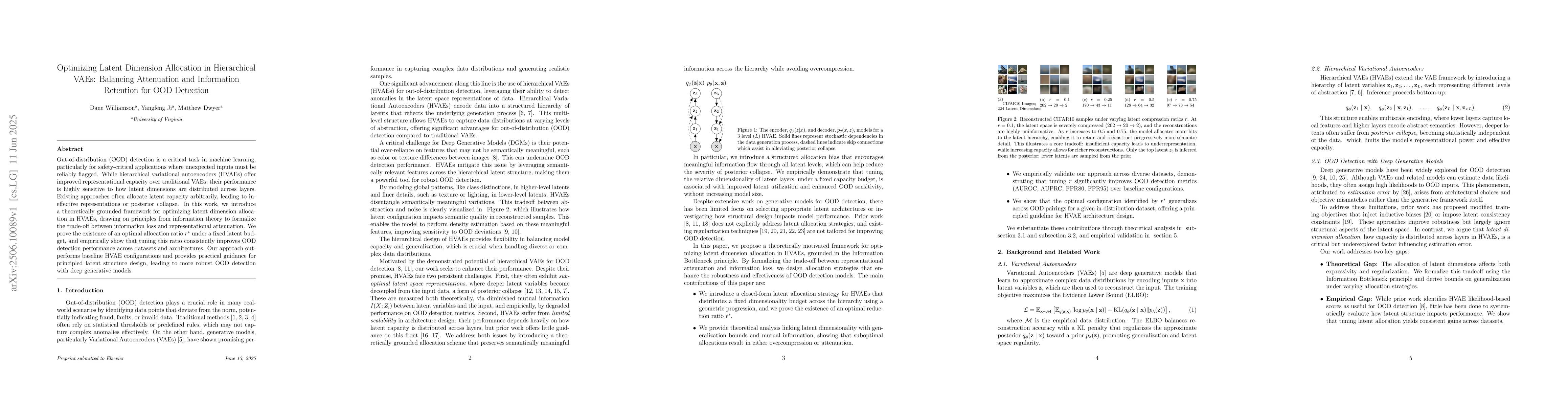 Out-of-distribution (OOD) detection is a critical task in machine learning, particularly for safety-critical applications where unexpected inputs must be reliably flagged. While hierarchical variational autoencoders (HVAEs) offer improved representational capacity over traditional VAEs, their performance is highly sensitive to how latent dimensions are distributed across layers. Existing approaches often allocate latent capacity arbitrarily, leading to ineffective representations or posterior collapse. In this work, we introduce a theoretically grounded framework for optimizing latent dimension allocation in HVAEs, drawing on principles from information theory to formalize the trade-off between information loss and representational attenuation. We prove the existence of an optimal allocation ratio $r^{\ast}$ under a fixed latent budget, and empirically show that tuning this ratio consistently improves OOD detection performance across datasets and architectures. Our approach outperforms baseline HVAE configurations and provides practical guidance for principled latent structure design, leading to more robust OOD detection with deep generative models.
