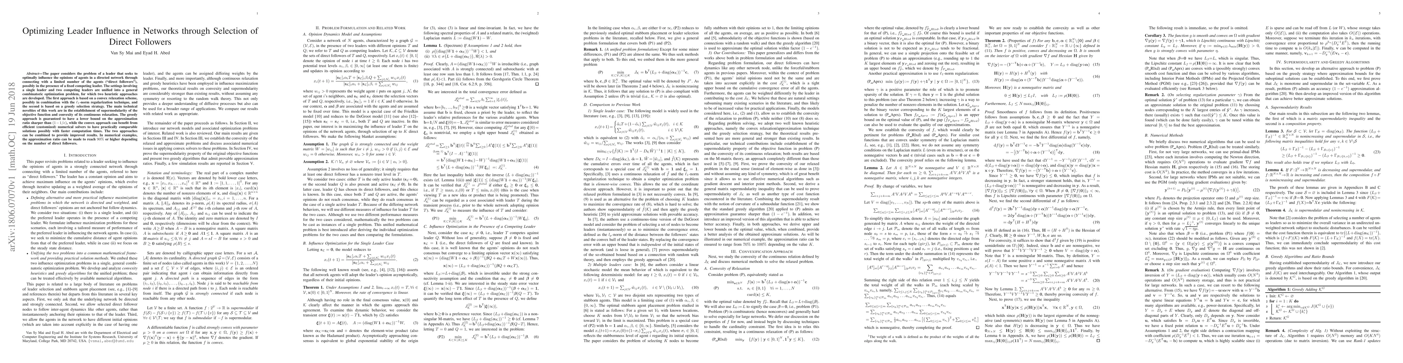 The paper considers the problem of a leader that seeks to optimally influence the opinions of agents in a directed network through connecting with a limited number of the agents ("direct followers"), possibly in the presence of a fixed competing leader. The settings involving a single leader and two competing leaders are unified into a general combinatoric optimization problem, for which two heuristic approaches are developed. The first approach is based on a convex relaxation scheme, possibly in combination with the $\ell_1$-norm regularization technique, and the second is based on a greedy selection strategy. The main technical novelties of this work are in the establishment of supermodularity of the objective function and convexity of its continuous relaxation. The greedy approach is guaranteed to have a lower bound on the approximation ratio sharper than $(1-1/e)$, while the convex approach can benefit from efficient (customized) numerical solvers to have practically comparable solutions possibly with faster computation times. The two approaches can be combined to provide improved results. In numerical examples, the approximation ratio can be made to reach $90\%$ or higher depending on the number of direct followers.