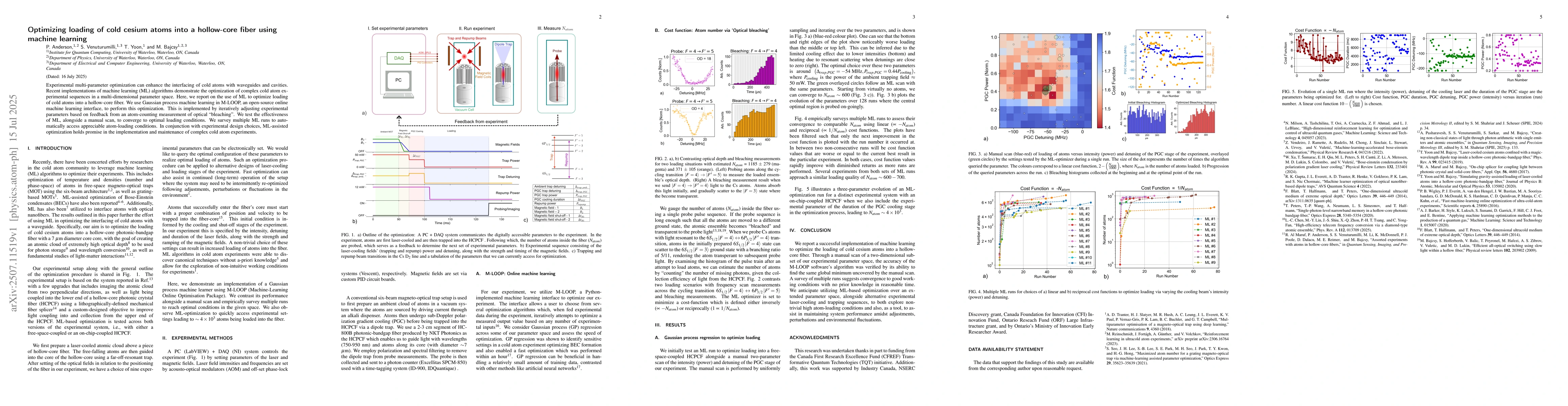 The research utilizes Gaussian process machine learning in M-LOOP, an open-source online machine learning interface, to optimize loading of cold cesium atoms into a hollow-core fiber. This is achieved by iteratively adjusting experimental parameters based on feedback from an atom-counting measurement of optical 'bleaching'.