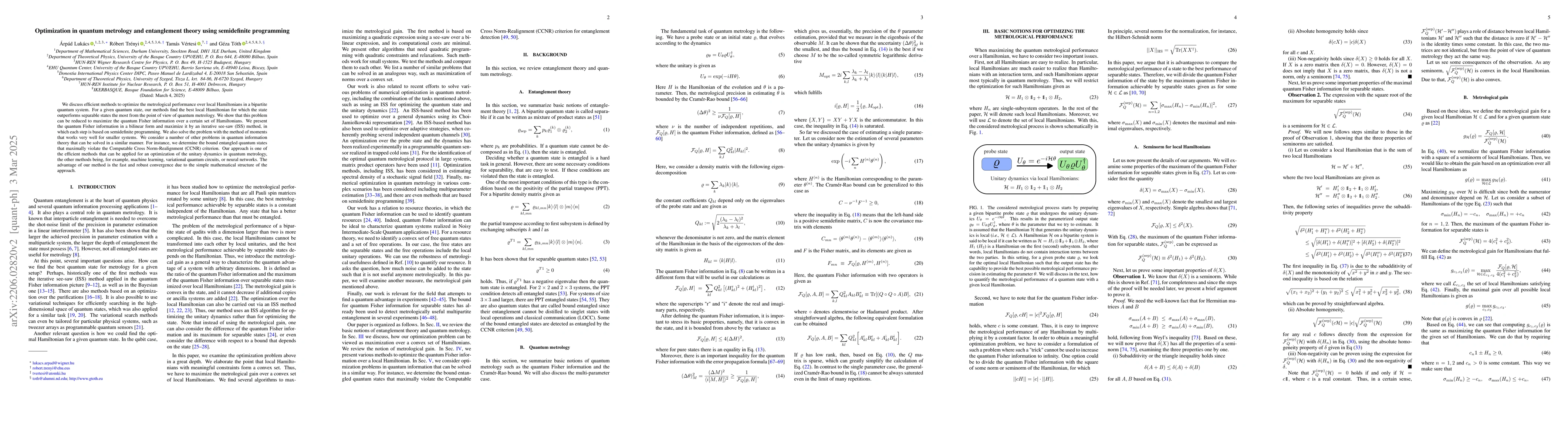 This paper presents methods to optimize local Hamiltonians for enhanced metrological performance in bipartite quantum systems, focusing on maximizing quantum Fisher information. The optimization is achieved through iterative semidefinite programming and the method of moments, applicable to various quantum information theory problems, including identifying bound entangled states.