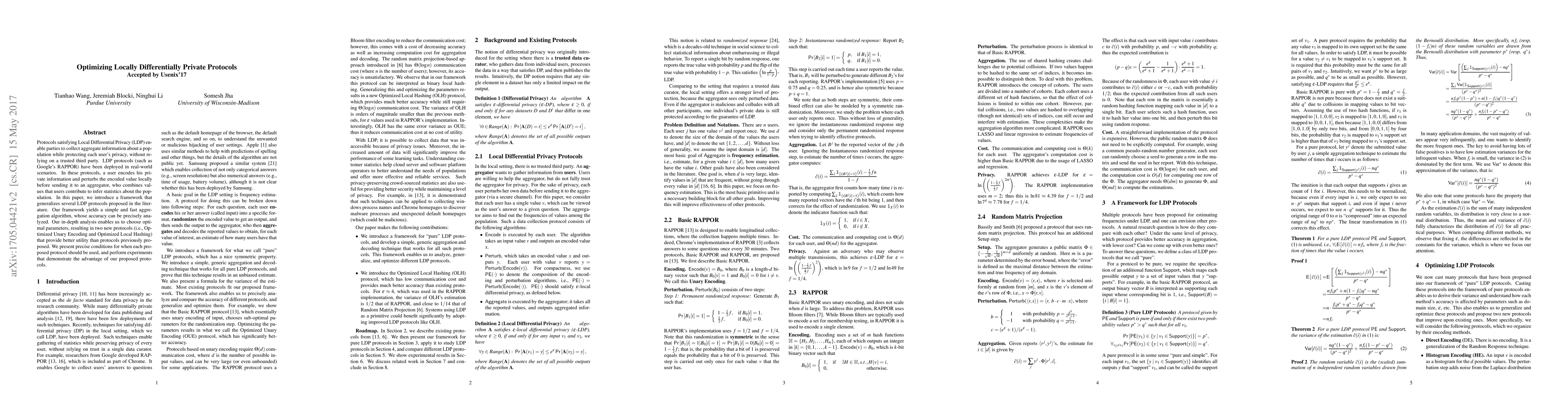 Protocols satisfying Local Differential Privacy (LDP) enable parties to collect aggregate information about a population while protecting each user's privacy, without relying on a trusted third party. LDP protocols (such as Google's RAPPOR) have been deployed in real-world scenarios. In these protocols, a user encodes his private information and perturbs the encoded value locally before sending it to an aggregator, who combines values that users contribute to infer statistics about the population. In this paper, we introduce a framework that generalizes several LDP protocols proposed in the literature. Our framework yields a simple and fast aggregation algorithm, whose accuracy can be precisely analyzed. Our in-depth analysis enables us to choose optimal parameters, resulting in two new protocols (i.e., Optimized Unary Encoding and Optimized Local Hashing) that provide better utility than protocols previously proposed. We present precise conditions for when each proposed protocol should be used, and perform experiments that demonstrate the advantage of our proposed protocols.