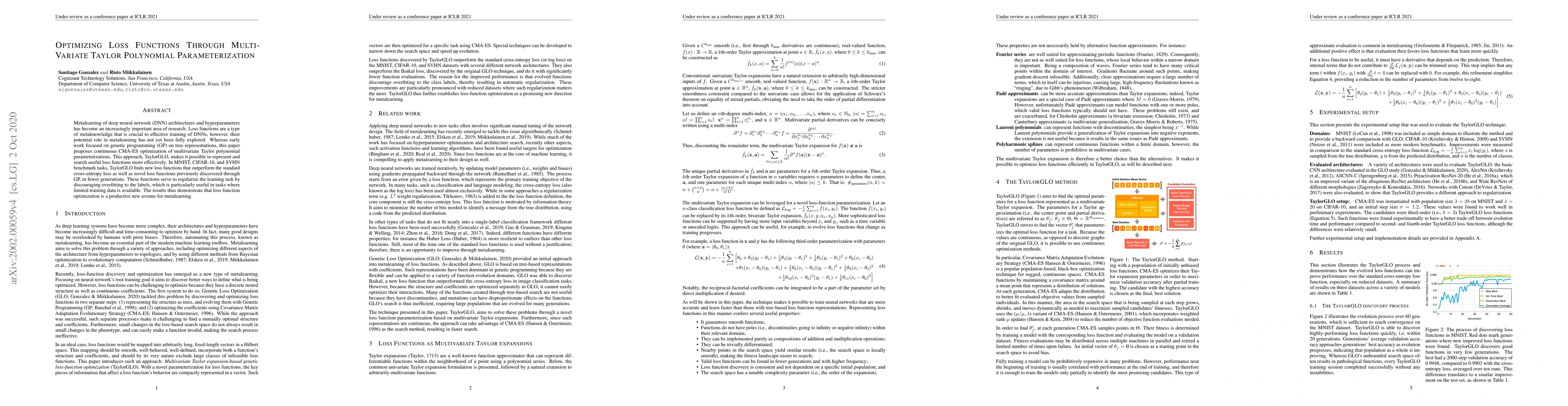 Metalearning of deep neural network (DNN) architectures and hyperparameters has become an increasingly important area of research. Loss functions are a type of metaknowledge that is crucial to effective training of DNNs, however, their potential role in metalearning has not yet been fully explored. Whereas early work focused on genetic programming (GP) on tree representations, this paper proposes continuous CMA-ES optimization of multivariate Taylor polynomial parameterizations. This approach, TaylorGLO, makes it possible to represent and search useful loss functions more effectively. In MNIST, CIFAR-10, and SVHN benchmark tasks, TaylorGLO finds new loss functions that outperform functions previously discovered through GP, as well as the standard cross-entropy loss, in fewer generations. These functions serve to regularize the learning task by discouraging overfitting to the labels, which is particularly useful in tasks where limited training data is available. The results thus demonstrate that loss function optimization is a productive new avenue for metalearning.