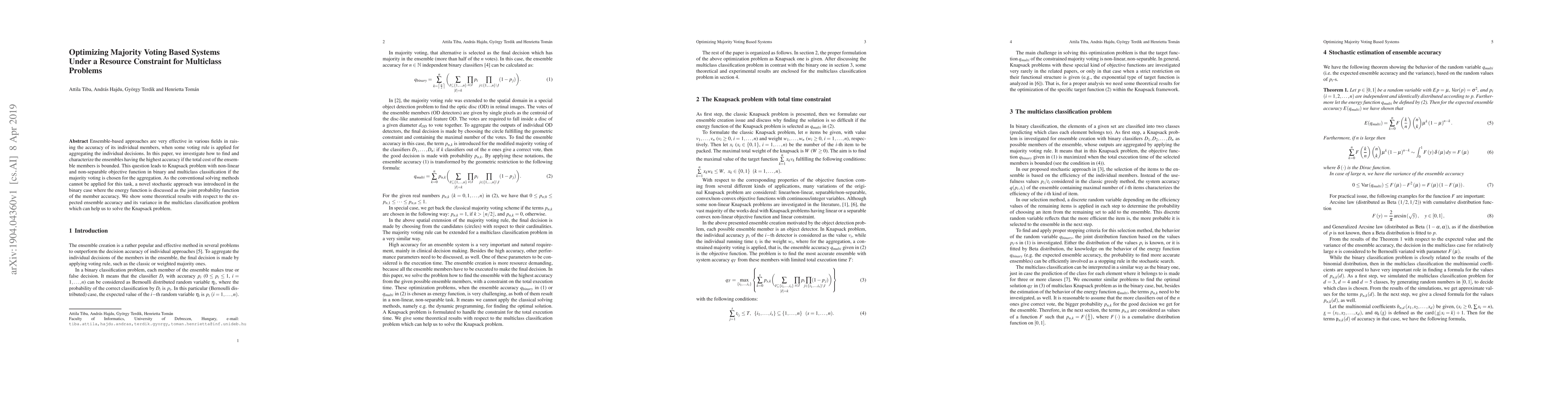 Ensemble-based approaches are very effective in various fields in raising the accuracy of its individual members, when some voting rule is applied for aggregating the individual decisions. In this paper, we investigate how to find and characterize the ensembles having the highest accuracy if the total cost of the ensemble members is bounded. This question leads to Knapsack problem with non-linear and non-separable objective function in binary and multiclass classification if the majority voting is chosen for the aggregation. As the conventional solving methods cannot be applied for this task, a novel stochastic approach was introduced in the binary case where the energy function is discussed as the joint probability function of the member accuracy. We show some theoretical results with respect to the expected ensemble accuracy and its variance in the multiclass classification problem which can help us to solve the Knapsack problem.