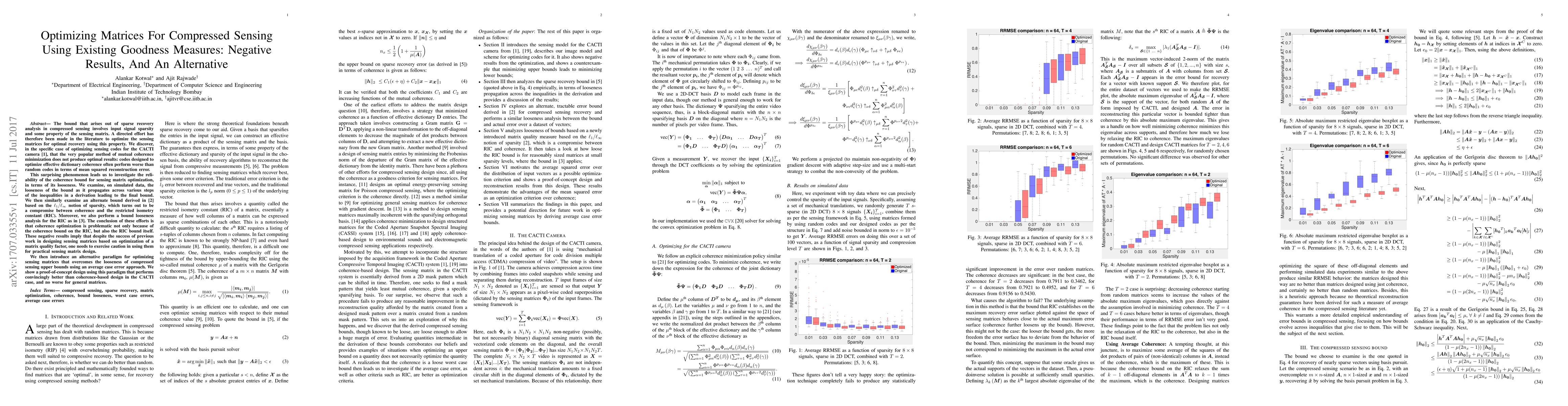 The bound that arises out of sparse recovery analysis in compressed sensing involves input signal sparsity and some property of the sensing matrix. An effort has therefore been made in the literature to optimize sensing matrices for optimal recovery using this property. We discover, in the specific case of optimizing codes for the CACTI camera, that the popular method of mutual coherence minimization does not produce optimal results: codes designed to optimize effective dictionary coherence often perform worse than random codes in terms of mean squared reconstruction error. This surprising phenomenon leads us to investigate the reliability of the coherence bound for matrix optimization, in terms of its looseness. We examine, on simulated data, the looseness of the bound as it propagates across various steps of the inequalities in a derivation leading to the final bound. We then similarly examine an alternate bound derived by Tang, G. et al, based on the $\ell_1/\ell_{\infty}$ notion of sparsity, which is a compromise between coherence and the restricted isometry constant (RIC). Moreover, we also perform a bound looseness analysis for the RIC as derived by Cai, T. et al. The conclusion of these efforts is that coherence optimization is problematic not only because of the coherence bound on the RIC, but also the RIC bound itself. These negative results imply that despite the success of previous work in designing sensing matrices based on optimization of a matrix quality factor, one needs to exercise caution in using them for practical sensing matrix design. We then introduce a paradigm for optimizing sensing matrices that overcomes the looseness of compressed sensing upper bounds using an average case error approach. We show a proof-of-concept design using this paradigm that performs convincingly better than coherence-based design in the CACTI case, and no worse for general matrices.