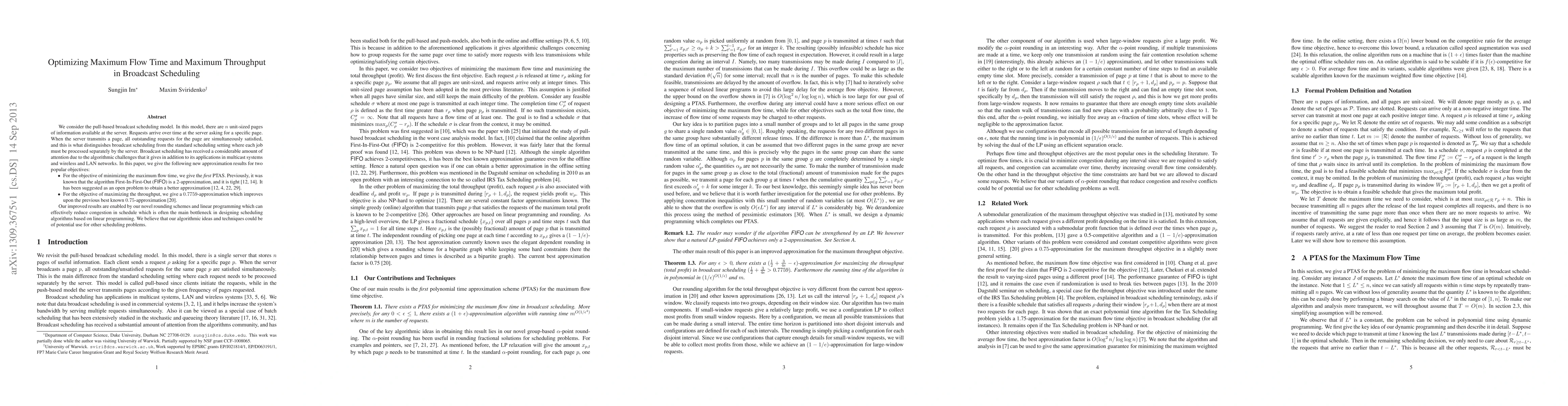 We consider the pull-based broadcast scheduling model. In this model, there are n unit-sized pages of information available at the server. Requests arrive over time at the server asking for a specific page. When the server transmits a page, all outstanding requests for the page are simultaneously satisfied, and this is what distinguishes broadcast scheduling from the standard scheduling setting where each job must be processed separately by the server. Broadcast scheduling has received a considerable amount of attention due to the algorithmic challenges that it gives in addition to its applications in multicast systems and wireless and LAN networks. In this paper, we give the following new approximation results for two popular objectives: - For the objective of minimizing the maximum flow time, we give the first PTAS. Previously, it was known that the algorithm First-In-First-Out (FIFO) is a 2-approximation, and it is tight. It has been suggested as an open problem to obtain a better approximation. - For the objective of maximizing the throughput, we give a 0.7759-approximation which improves upon the previous best known 0.75-approximation. Our improved results are enabled by our novel rounding schemes and linear programming which can effectively reduce congestion in schedule which is often the main bottleneck in designing scheduling algorithms based on linear programming. We believe that our algorithmic ideas and techniques could be of potential use for other scheduling problems.